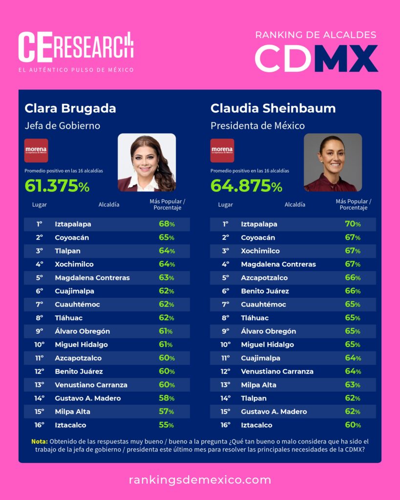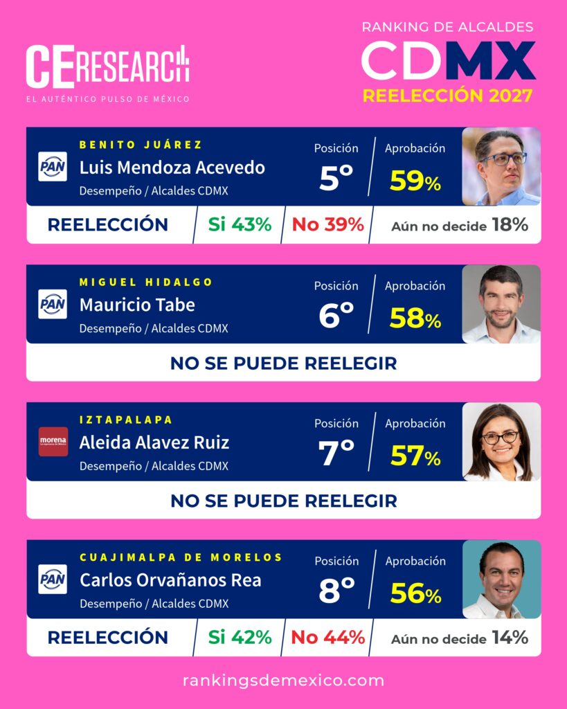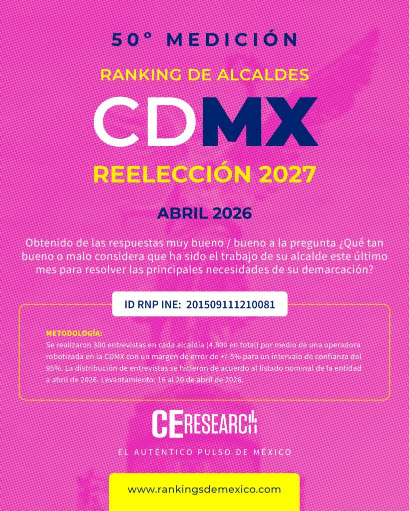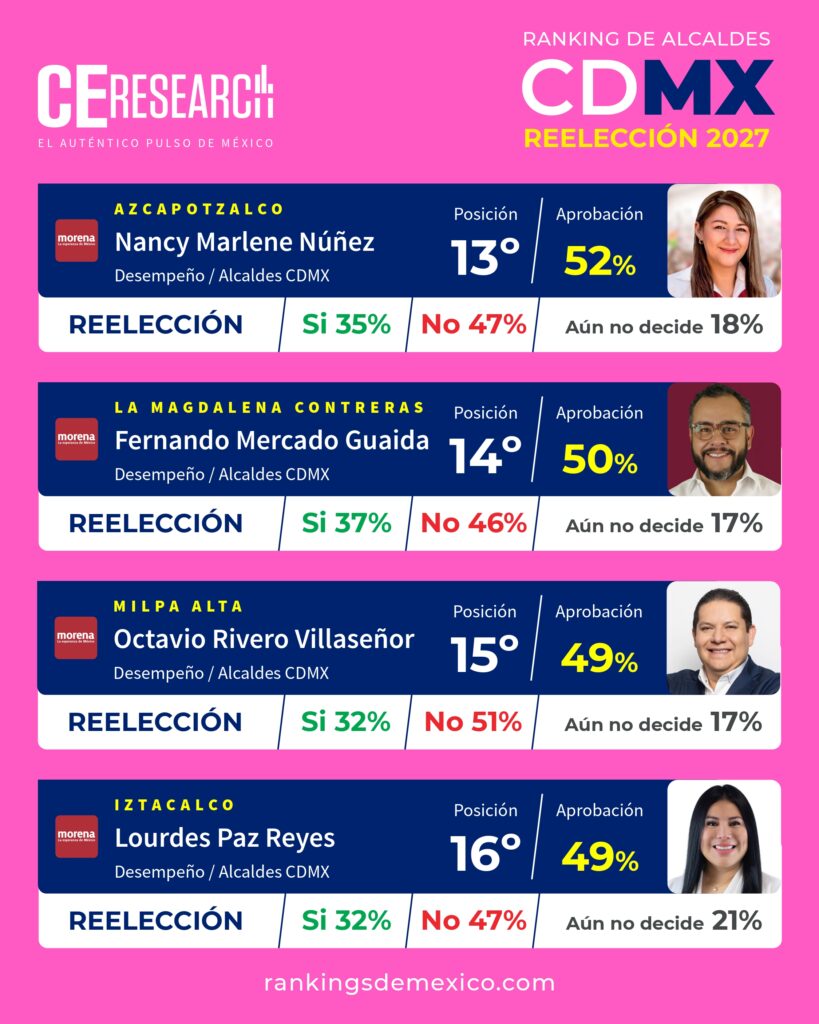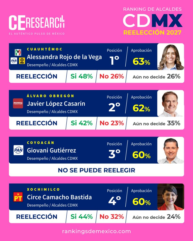 CE Research. 21 de abril 2026.- Alessandra Rojo de la Vega sigue siendo la alcaldesa mejor evaluada por sus ciudadanos en la CDMX, seguida por Javier López Casarín, de Álvaro Obregón (2°); Giovani Gutiérrez, de Coyoacán (3°); Circe Camacho de Xochimilco (4°); y Luis Mendoza, de Miguel Hidalgo (5°).