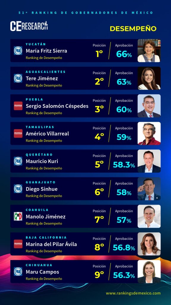 - En el top ten hay 5 panistas, 3 morenistas, 1 priista, y un gobernador de MC.