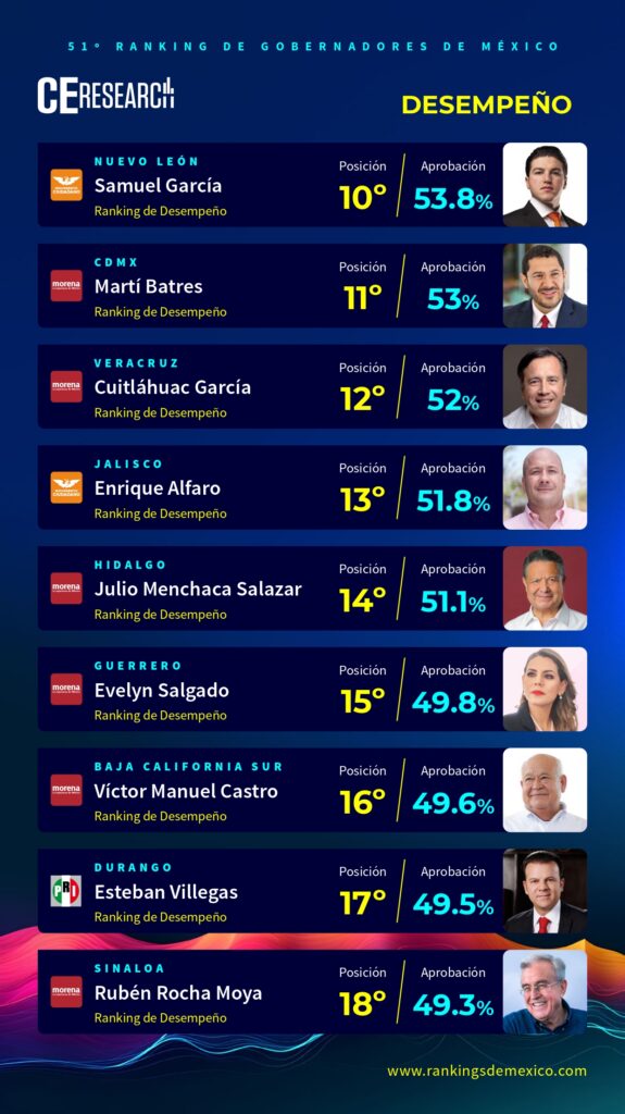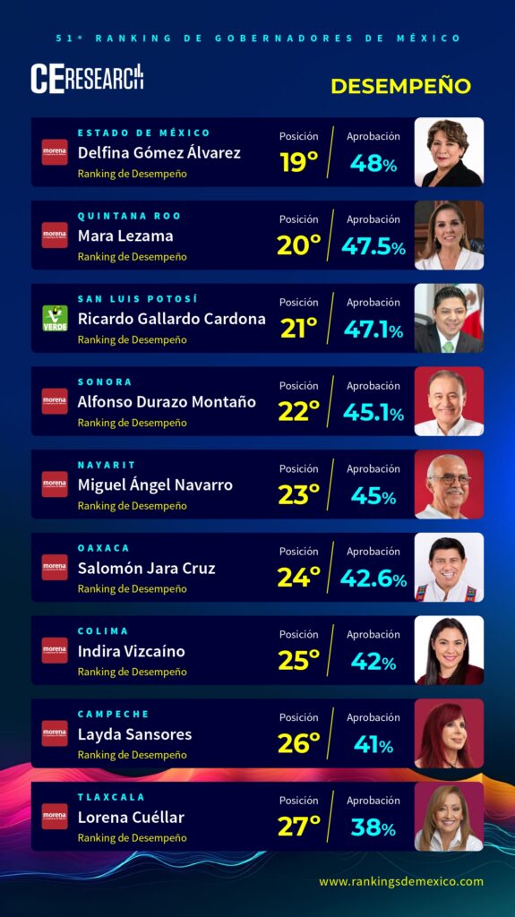 - El gobernador de Puebla, Sergio Salomón, ocupa por primera ocasión la 3a plaza y es el mandatario de MORENA mejor evaluado.