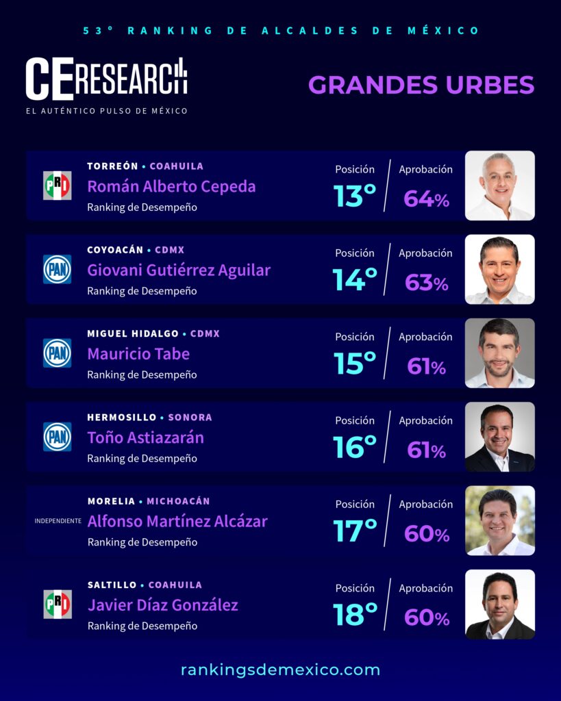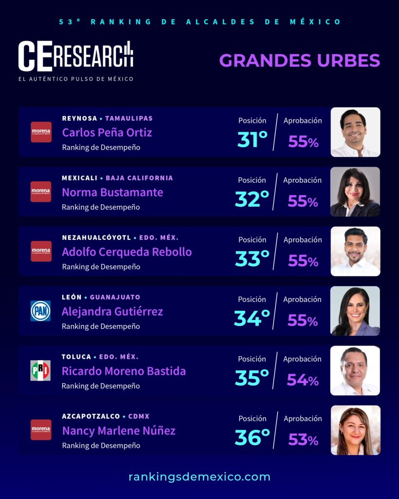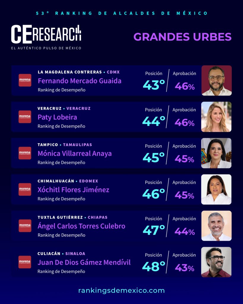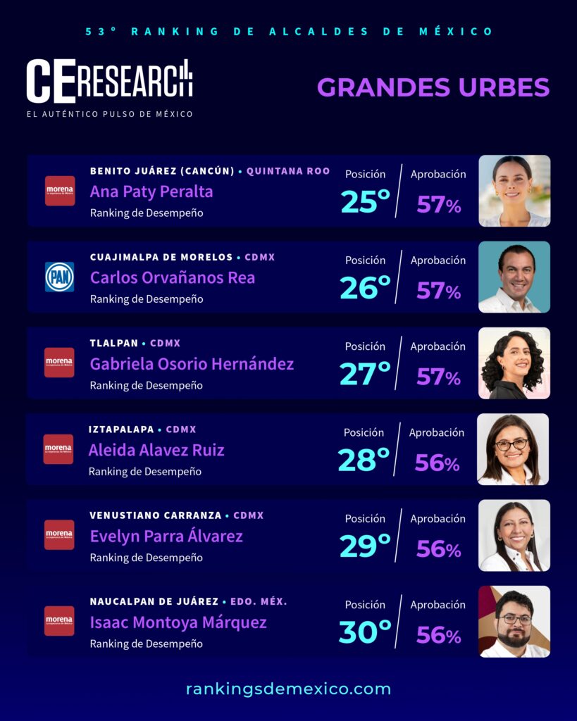 CE Research. 15 de octubre 2025.- Los alcaldes de Querétaro, FeliFer Macías; Mérida, Cecilia Patrón; Puebla, José Chedraui; Cuauhtémoc (CDMX), Alessandra Rojo; y Tijuana, Ismael Burgueño; son los 5 mejor evaluados del país por su trabajo de acuerdo a nuestra nueva evaluación mensual en ciudades con más de 600 mil habitantes.