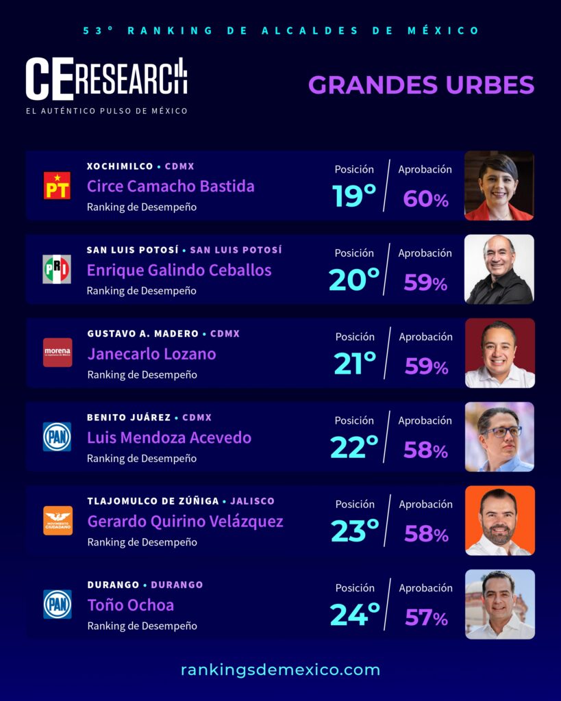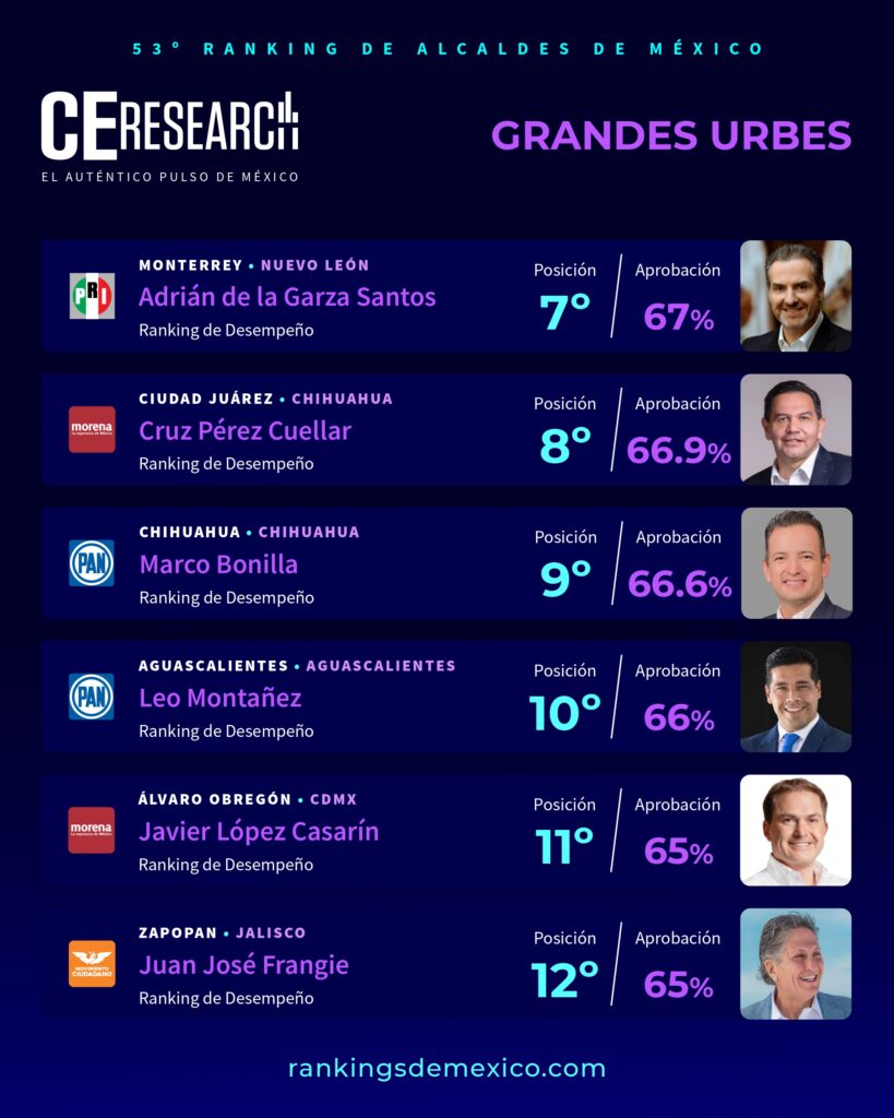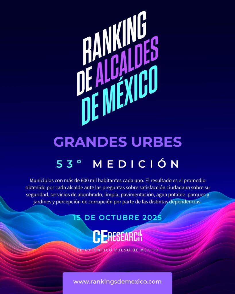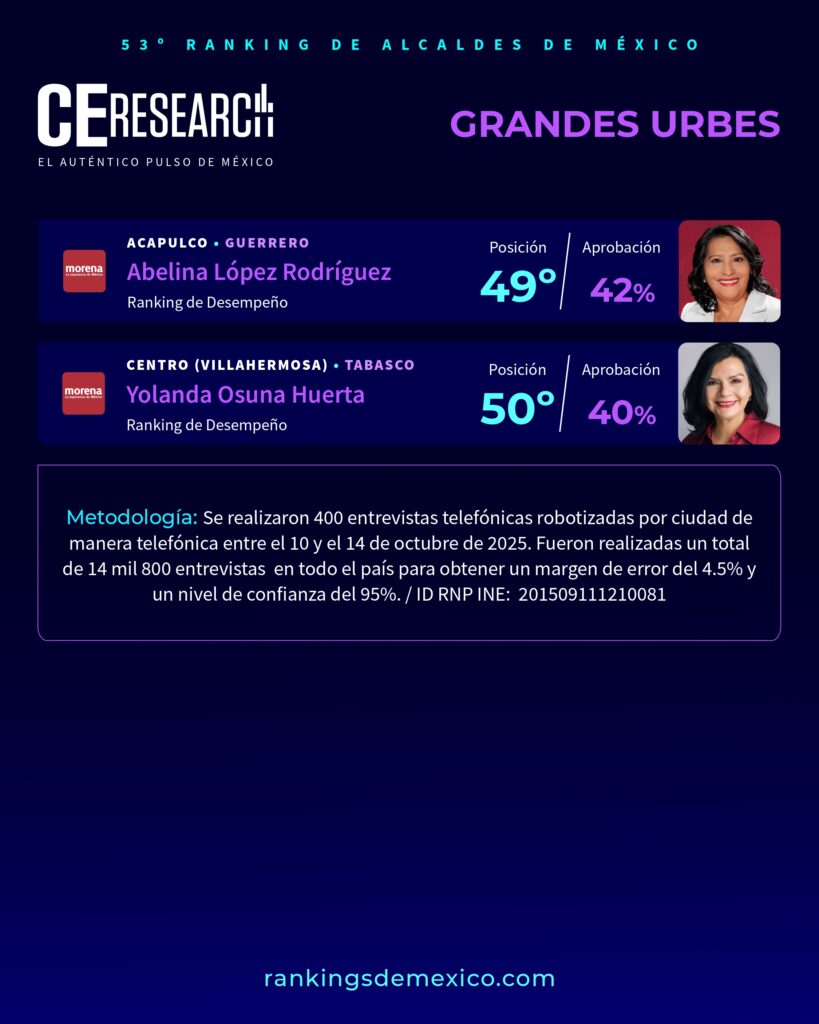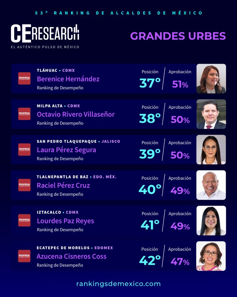 CE Research. 15 de octubre 2025.- Los alcaldes de Querétaro, FeliFer Macías; Mérida, Cecilia Patrón; Puebla, José Chedraui; Cuauhtémoc (CDMX), Alessandra Rojo; y Tijuana, Ismael Burgueño; son los 5 mejor evaluados del país por su trabajo de acuerdo a nuestra nueva evaluación mensual en ciudades con más de 600 mil habitantes.