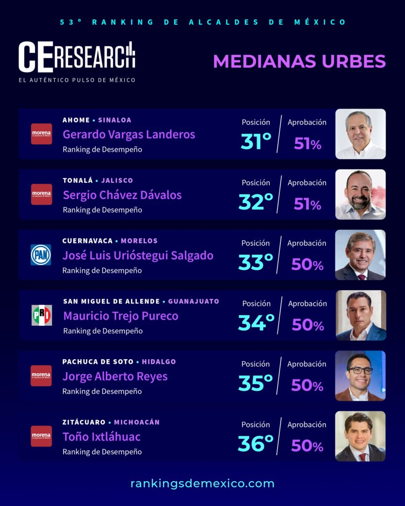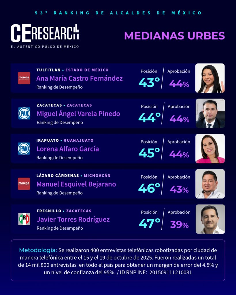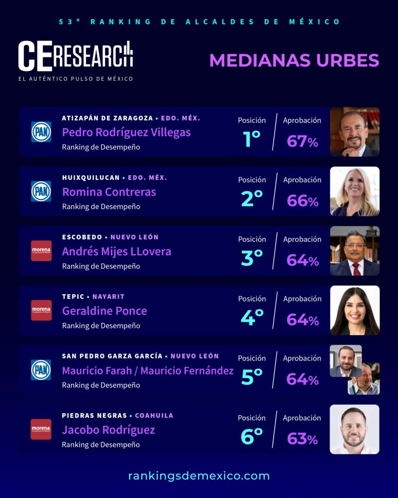 CE Research. 20 de octubre 2025.- Los alcaldes Pedro Rodríguez de Atizapán y Romina Contreras en Huixquilucan, EdoMex; Andrés Mijes de Escobedo en Nuevo León; Geraldine Ponce de Tepic en Nayarit; y una dupla inédita en San Pedro Garza García; son los 5 mejores del país por su trabajo según sus propios ciudadanos.