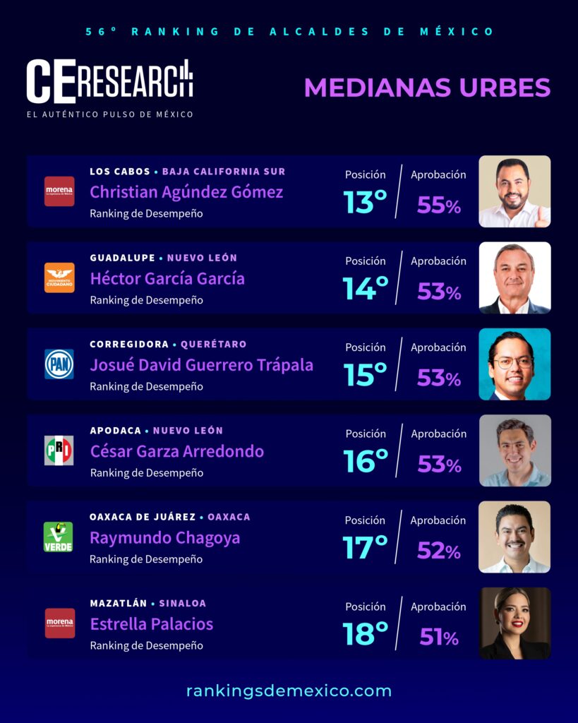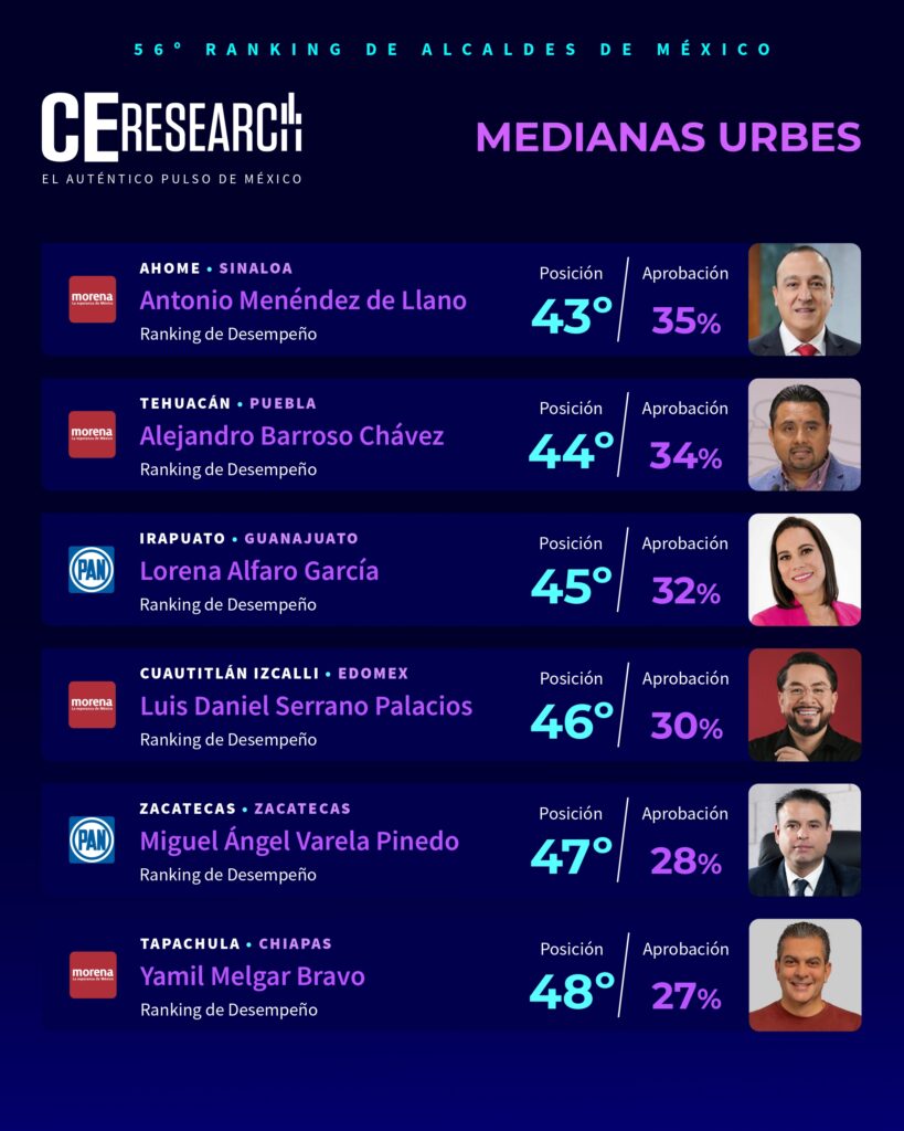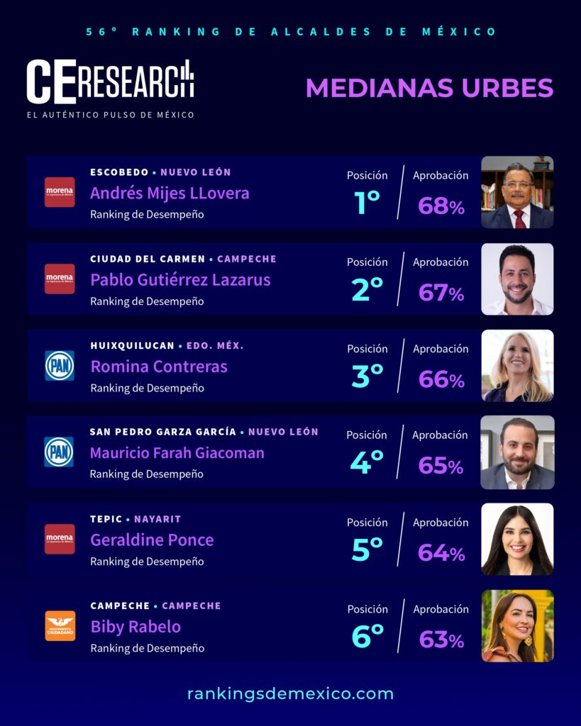 CE Research. 21 de enero 2026.- Andrés Mijes de Escobedo, en Nuevo León; Pablo Gutiérrez Lazarus de Ciudad del Carmen, Campeche; Romina Contreras de Huixquilucan, en EdoMex; Mauricio Farah, de San Pedro, Nuevo León; y Geraldine Ponce, de Tepic, Nayarit; son los 5 alcaldes mejor evaluados del país por sus gobernados en ciudades con menos de 600 mil habitantes.