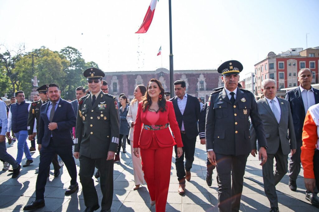 La gobernadora dio inicio a la conmemoración con los Honores a la Bandera en Plaza Patria, acompañada de autoridades civiles y militares. Posteriormente, se trasladó al templete oficial ubicado en la calle Moctezuma, desde donde presenció el paso de los contingentes.