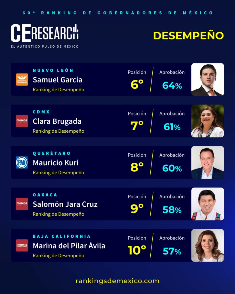 Abajo de ellos, completando el top ten, están Samuel García de NL; Clara Brugada de CMX; Mauricio Kuri de Querétaro; Salomón Jara de Oaxaca y Marina del Pilar de Baja California.
