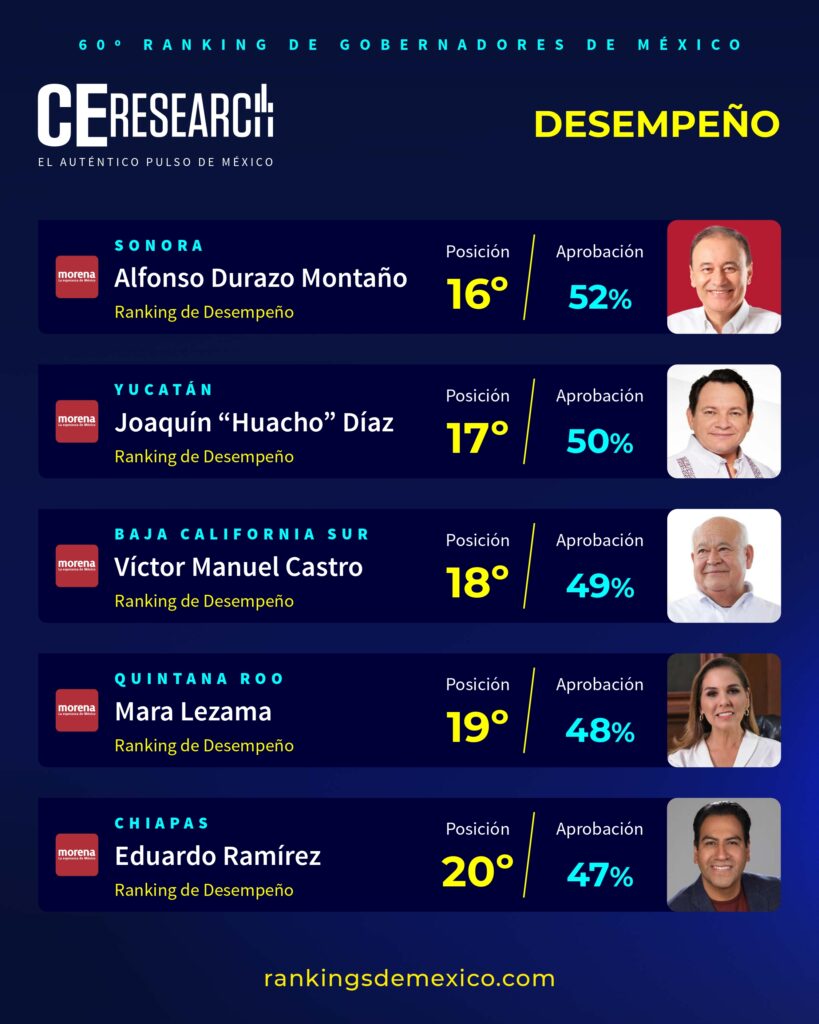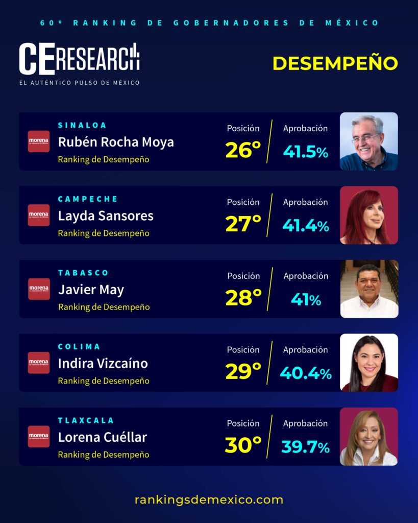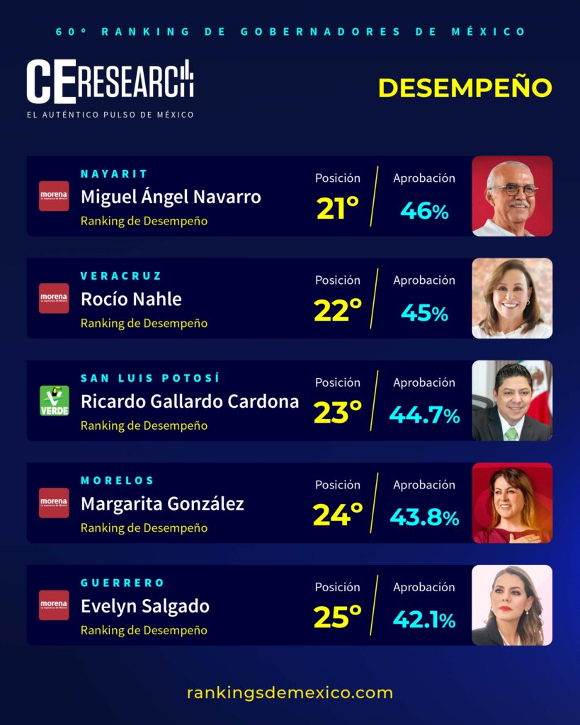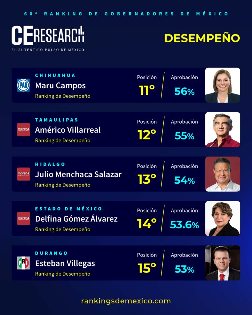 Tere Jiménez, de Aguascalientes; Manolo Jiménez de Coahuila; Libia García de Guanajuato; Lemus de Jalisco; y Alejandro Armenta de Puebla; ocuparon este mes las 5 mejores plazas por DESEMPEÑO.