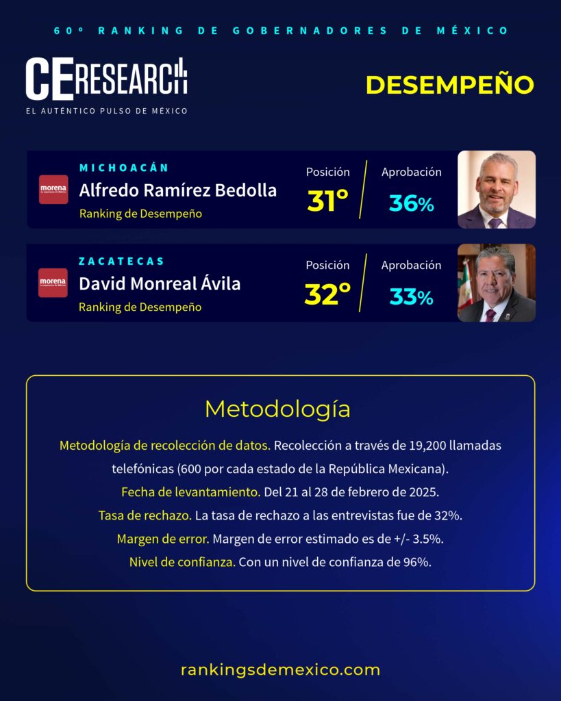 CE Research. 03 de marzo 2025.– Dos panistas, un priista, un MC y un morenista, ocupan el top 5 de los gobernadores mejor evaluados de México por el trabajo que realizan y según sus propios gobernados.