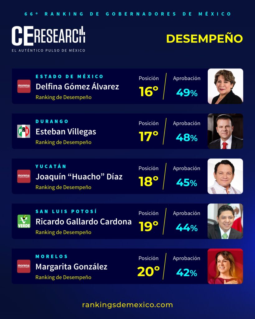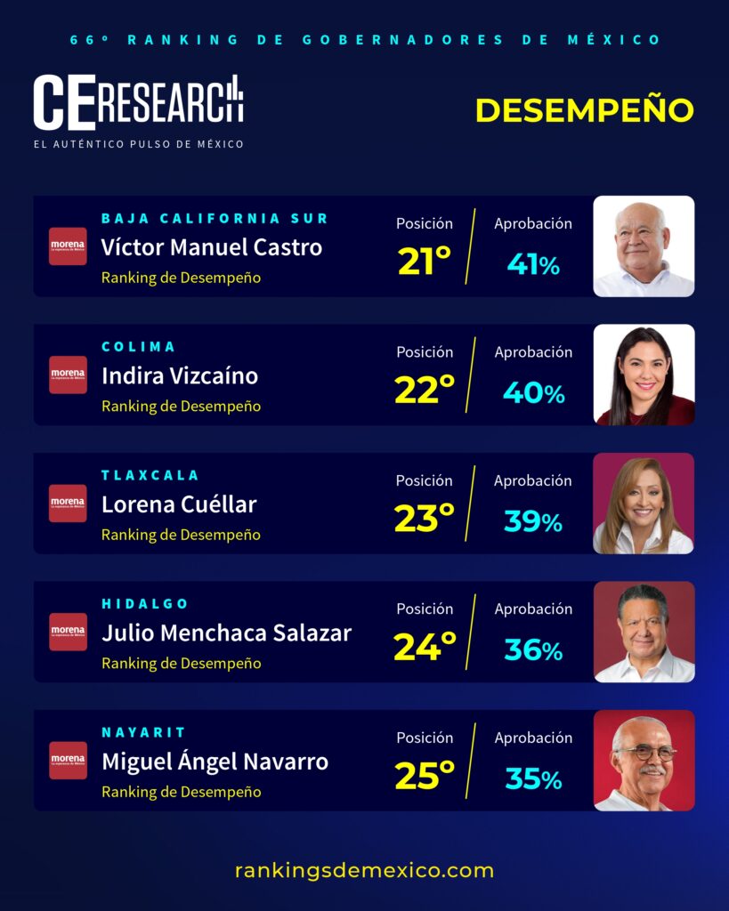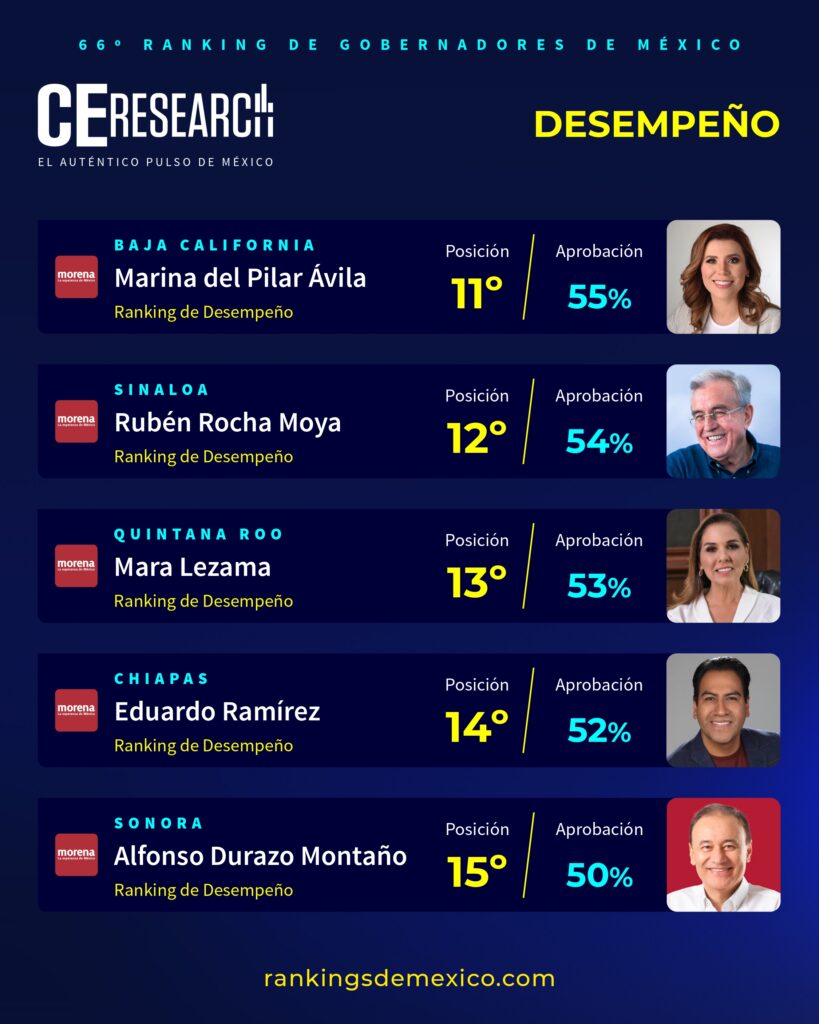 CE Research. 01 de septiembre 2025.– La gobernadora de Guanajuato, Libia García repunta y se coloca como la gobernadora mejor evaluada de México. Le siguen Samuel García de Nuevo León; Tere Jiménez, de Aguascalientes; Manolo Jiménez, de Coahuila; y Alejandro Armenta, de Puebla, quien además es el mejor morenista de entre 22 mandatarios emanados de ese partido.