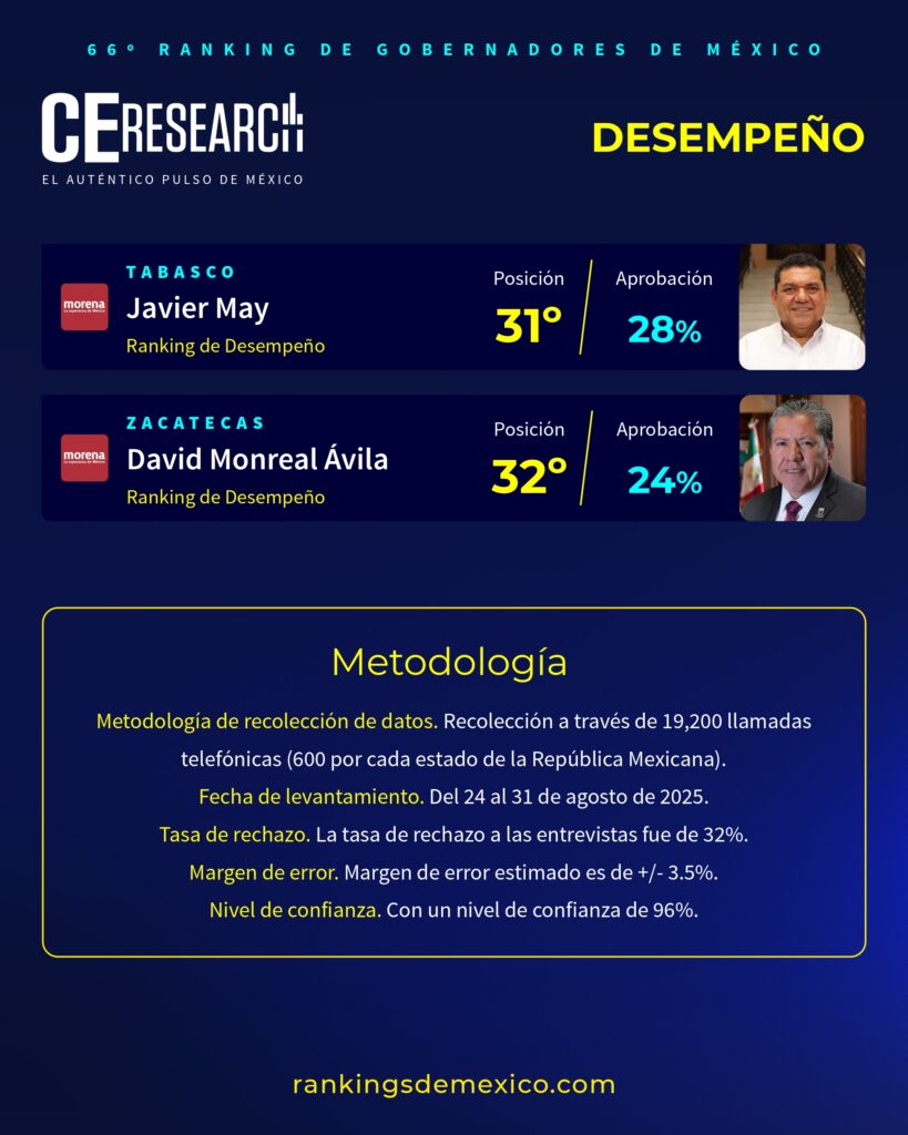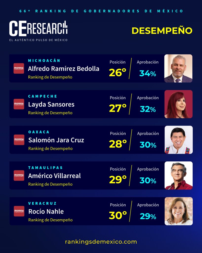 Las últimas posiciones, otra vez, son encabezadas por el mandatario de Zacatecas, David Monreal; Javier May, de Tabasco; y Américo Villarreal de Tamaulipas .