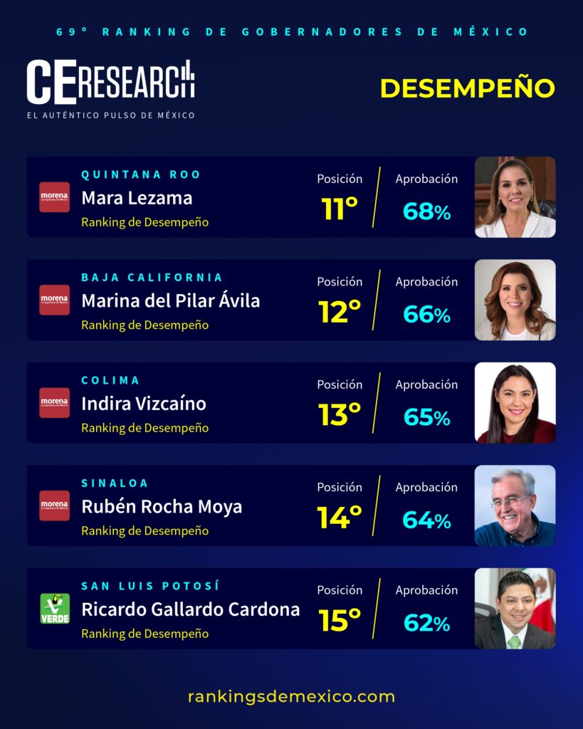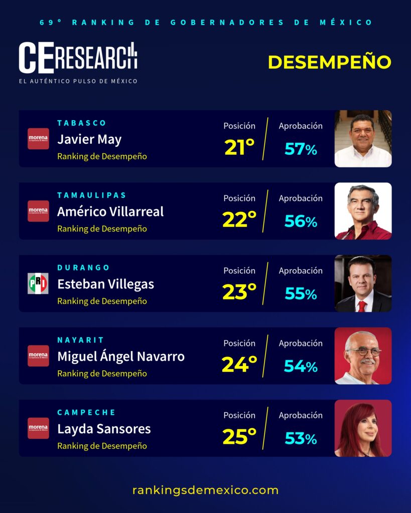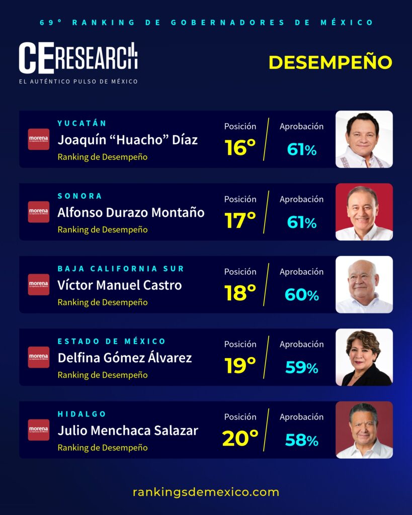 CE Research. 01 de diciembre 2025.– En nuestra penúltima medición anual del ranking de gobernadores, Manolo Jiménez, de Coahuila, es el mandatario mejor evaluado del país; le siguen los gobernadores de Jalisco, Pablo Lemus; de Guerrero, Evelyn Salgado; de Puebla, Alejandro Armenta; y de Aguascalientes, Tere Jiménez.
