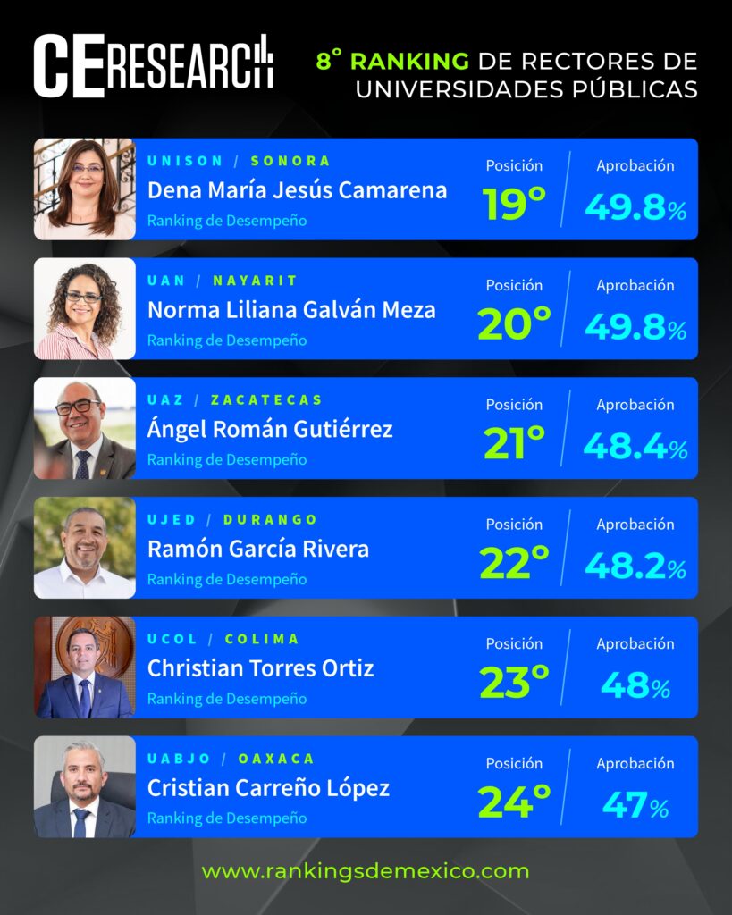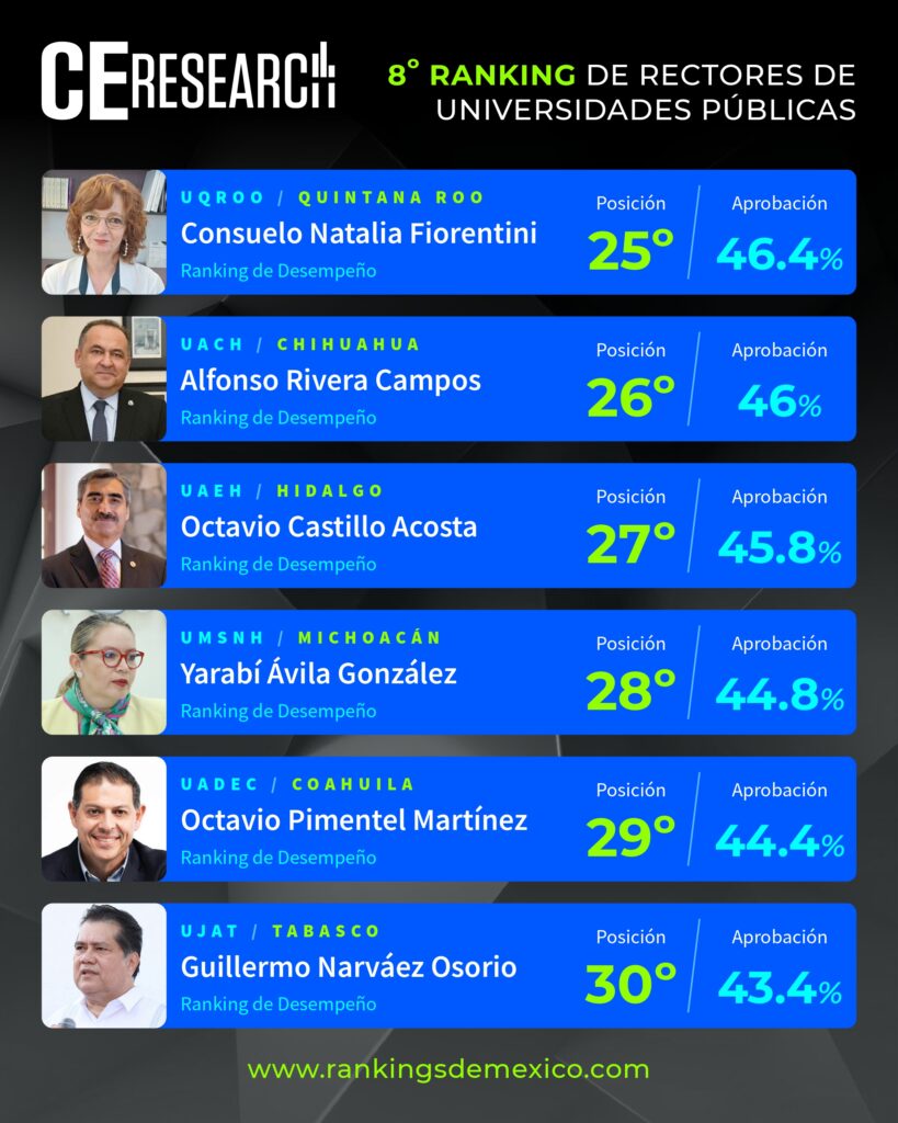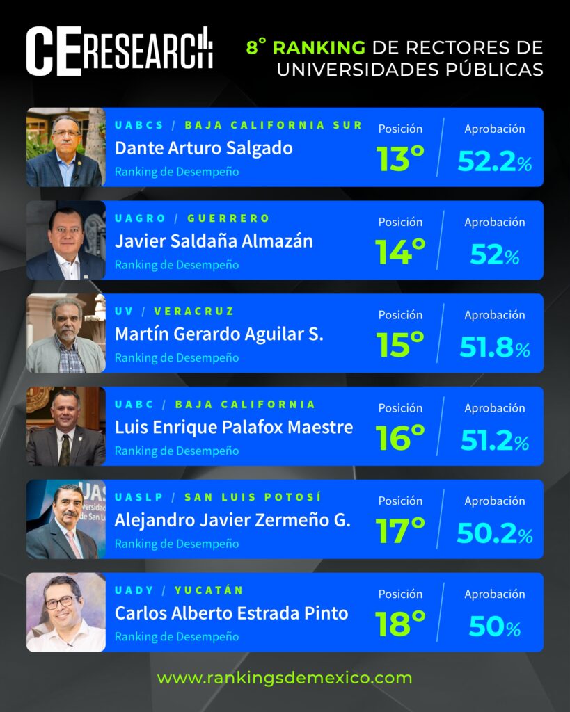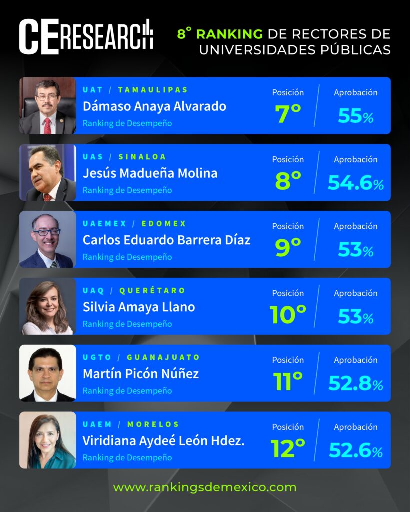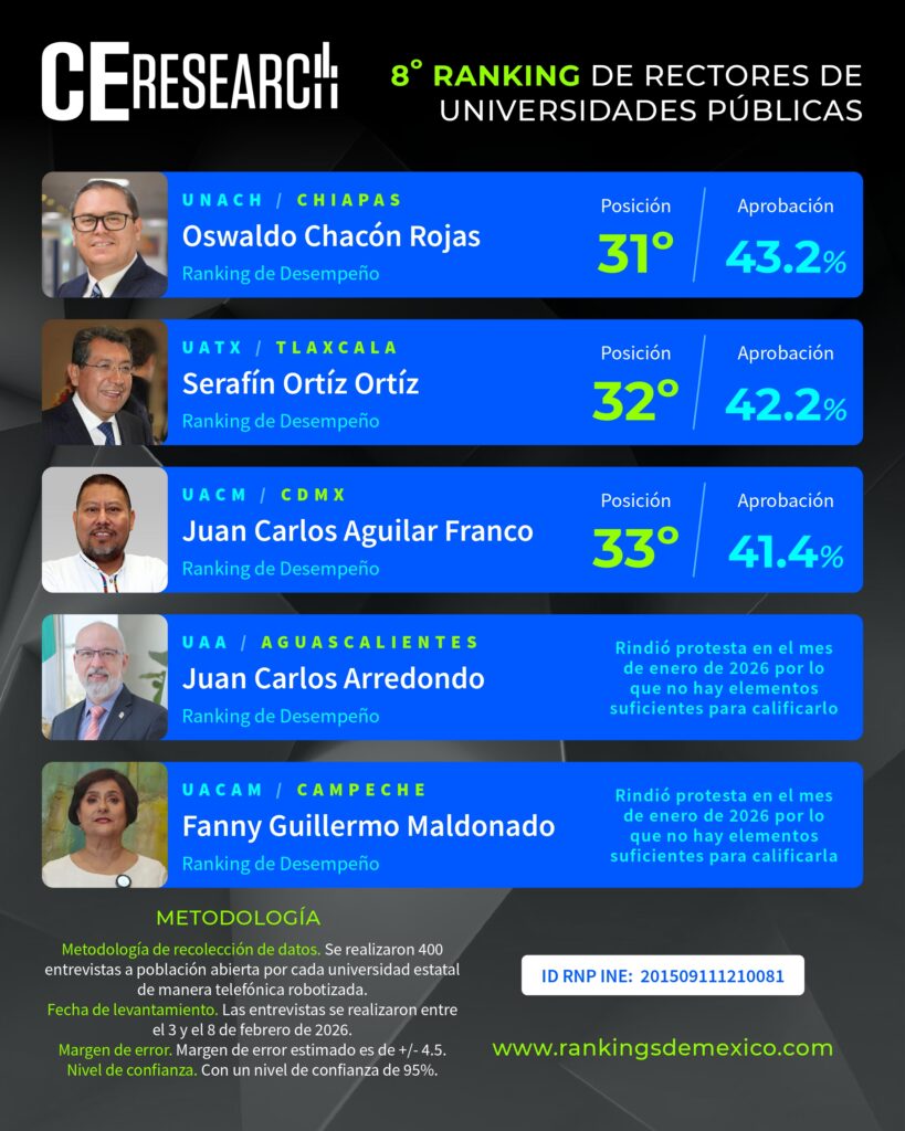 CE Research. 09 de febrero 2026.- Los rectores de la UNAM, Leonardo Lomelí; la BUAP, Lilia Cedillo; la UAM, Gustavo Pacheco; la UANL, Santos Guzmán; y el IPN, Arturo Reyes; son los 5 mejor calificados del país por su desempeño, donde la gente de sus respectivos estados les dieron buenas notas por el trabajo que realizan en materia de reputación personal, la búsqueda de mayor matrícula, mejora y ampliación de planteles, y el buen uso de recursos públicos.