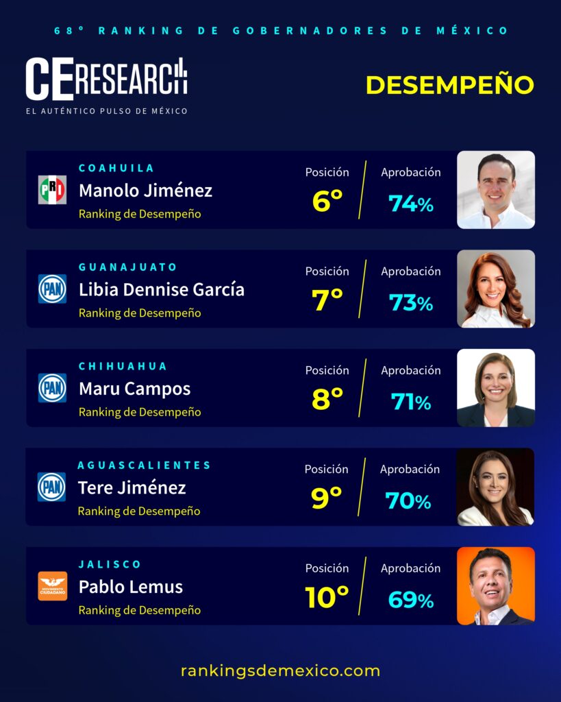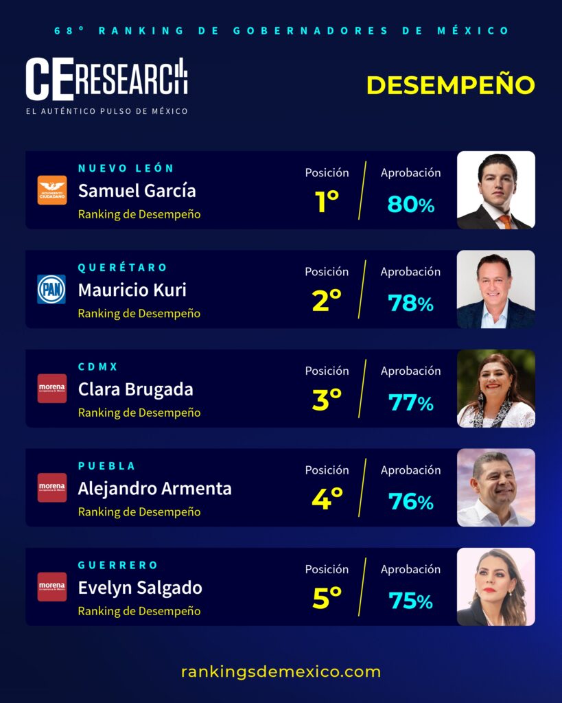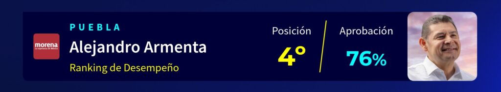 Con 76 por ciento de aprobación, Alejandro Armenta, gobernador de Puebla, se posicionó como el cuarto mandatario mejor evaluado del país en el 68 Ranking de Gobernadores elaborado por la encuestadora CE Research, que mide el desempeño de las y los mandatarios estatales en áreas como seguridad, servicios públicos, salud y economía.