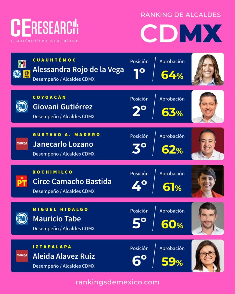 El más reciente Ranking de Alcaldes CDMX de CE Research coloca a Alessandra Rojo de la Vega, de Cuauhtémoc, como la alcaldesa mejor evaluada de la capital a cierre de año, con 64% de aprobación.