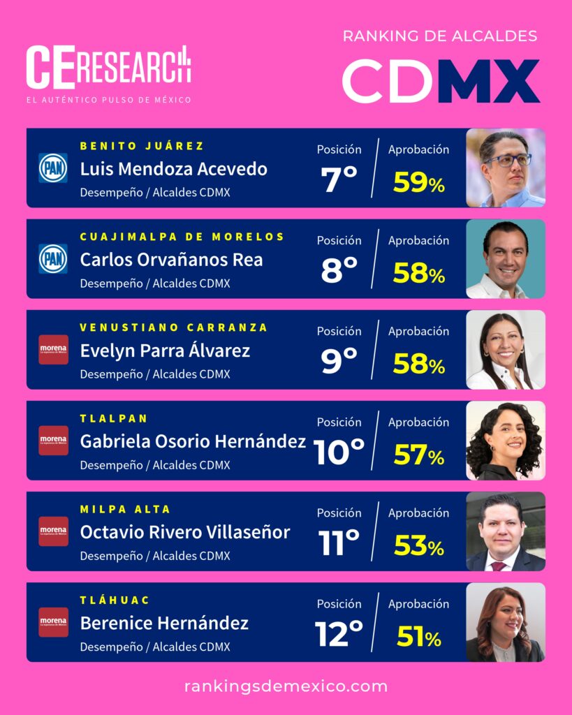 El Top 5 lo completan Circe Camacho Bastida, de Xochimilco (61%) y Mauricio Tabe, de Miguel Hidalgo (60%), mientras que en el resto del Top 10 aparecen: