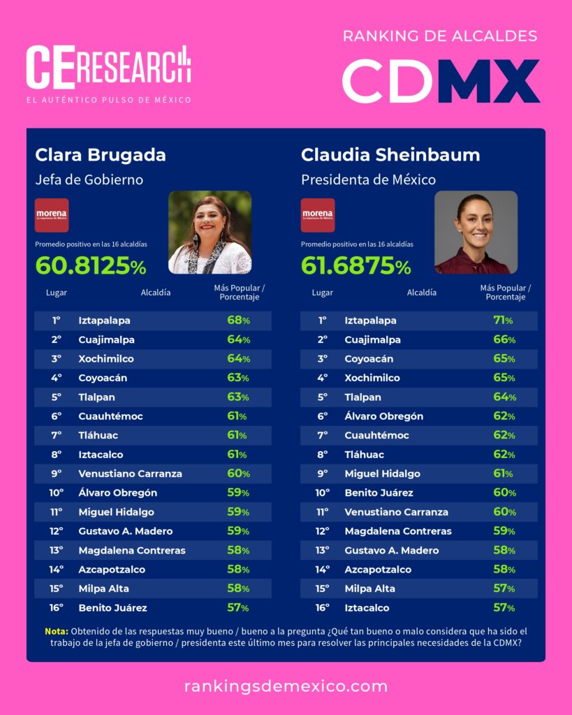 Por su parte, la jefa de gobierno, Clara Brugada, registró una aprobación promediada entre las 16 alcaldías de 60.81%. Mientras, la aprobación promediada de la presidenta Claudia Sheinbaum fue de 61.68%. Iztapalapa fue la alcaldía que más las aprobó, con el 68% y 71%, respectivamente.