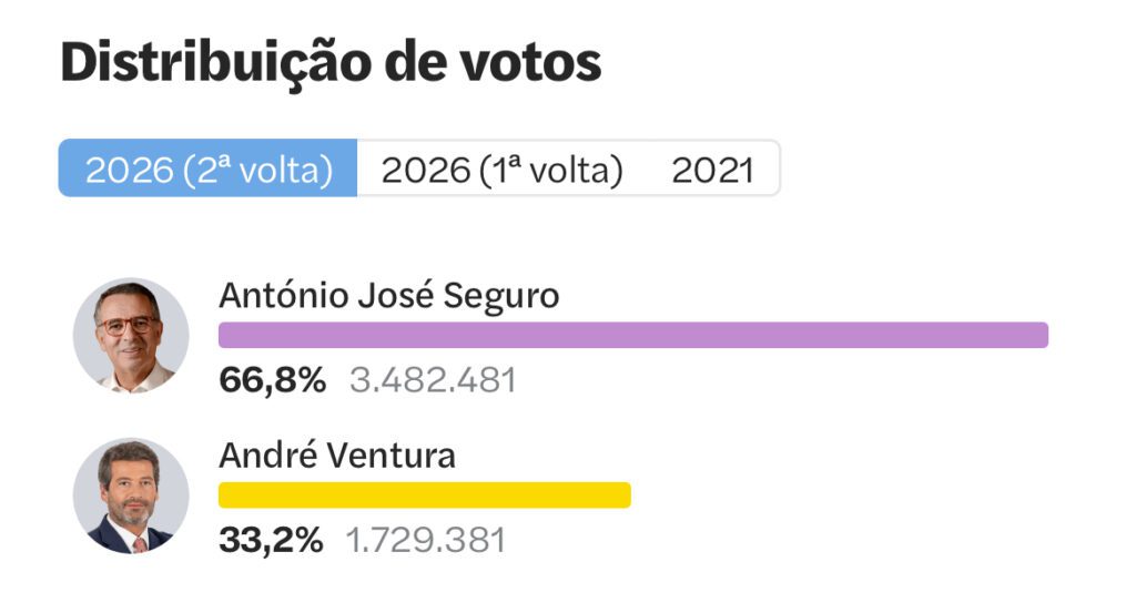 Con casi el 100% de los votos escrutados por la Comisión Nacional de Elecciones, Seguro lideró la elección con el 66.4% de los sufragios (3 millones 482 mil 481), asegurando un mandato de cinco años como sucesor de Marcelo Rebelo de Sousa y el regreso de la izquierda después de veinte años.