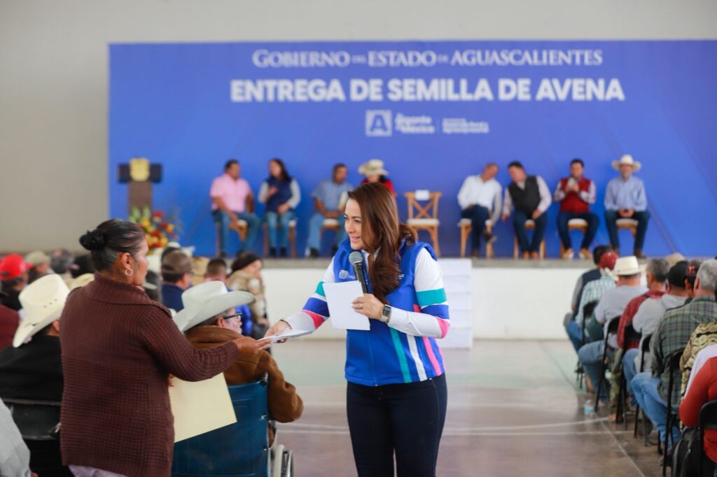 En el Auditorio Polivalente de Tepezalá, la gobernadora de Aguascalientes, Tere Jiménez, entregó semilla de avena a 2 mil productores de Rincón de Romos, Cosío, Pabellón de Arteaga, Tepezalá, Asientos, San José de Gracia, Jesús María y San Francisco de los Romo, con una inversión de 5 millones de pesos.