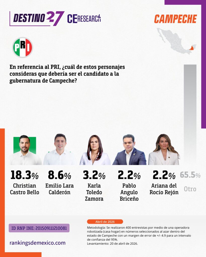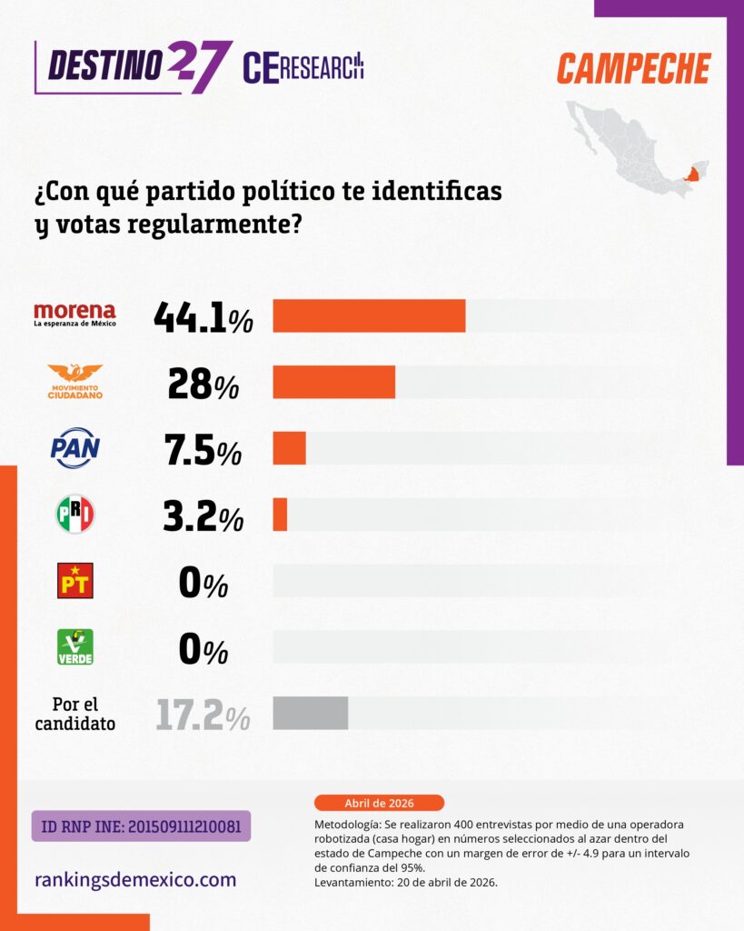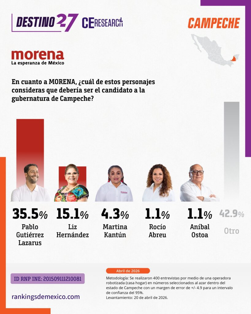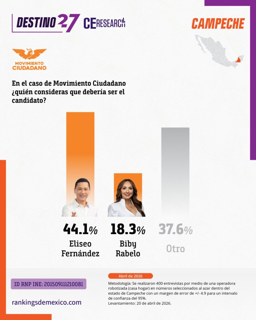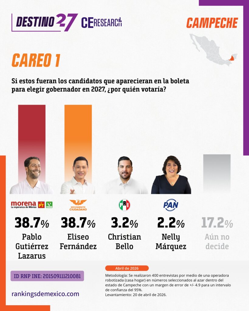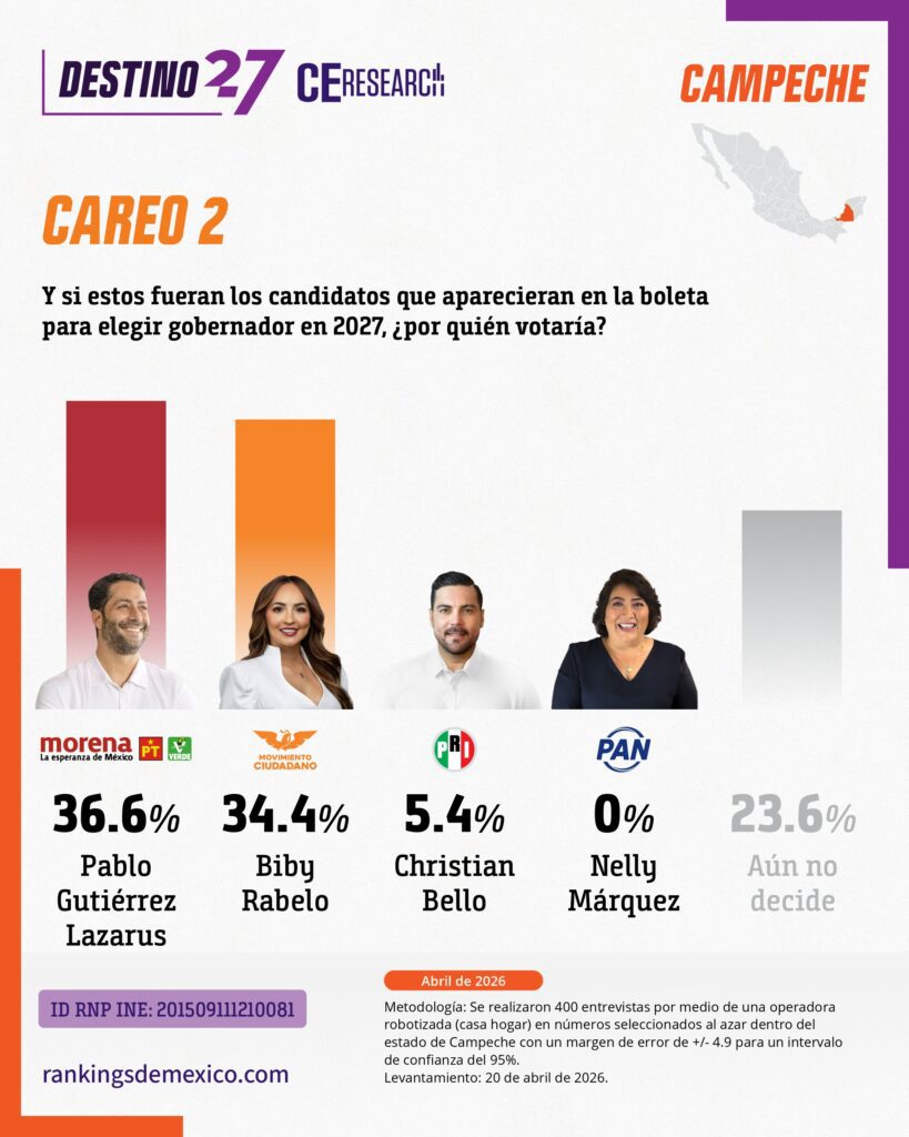 CE Research. 20 de abril 2026.- Campeche podría ser el primer estado que pierde MORENA en su historia, y lo haría a manos de MC.