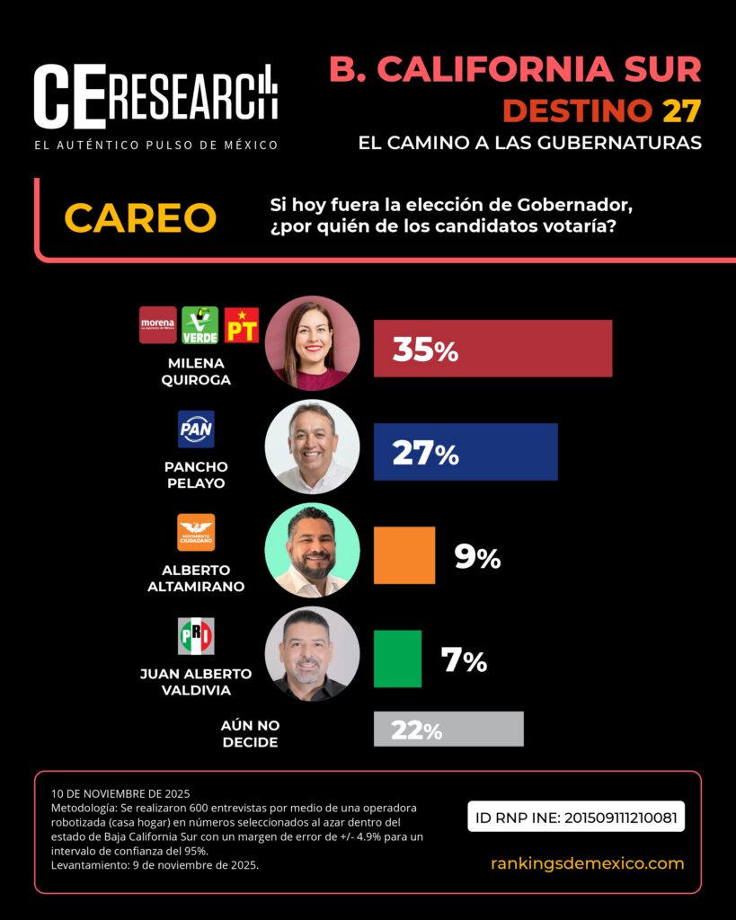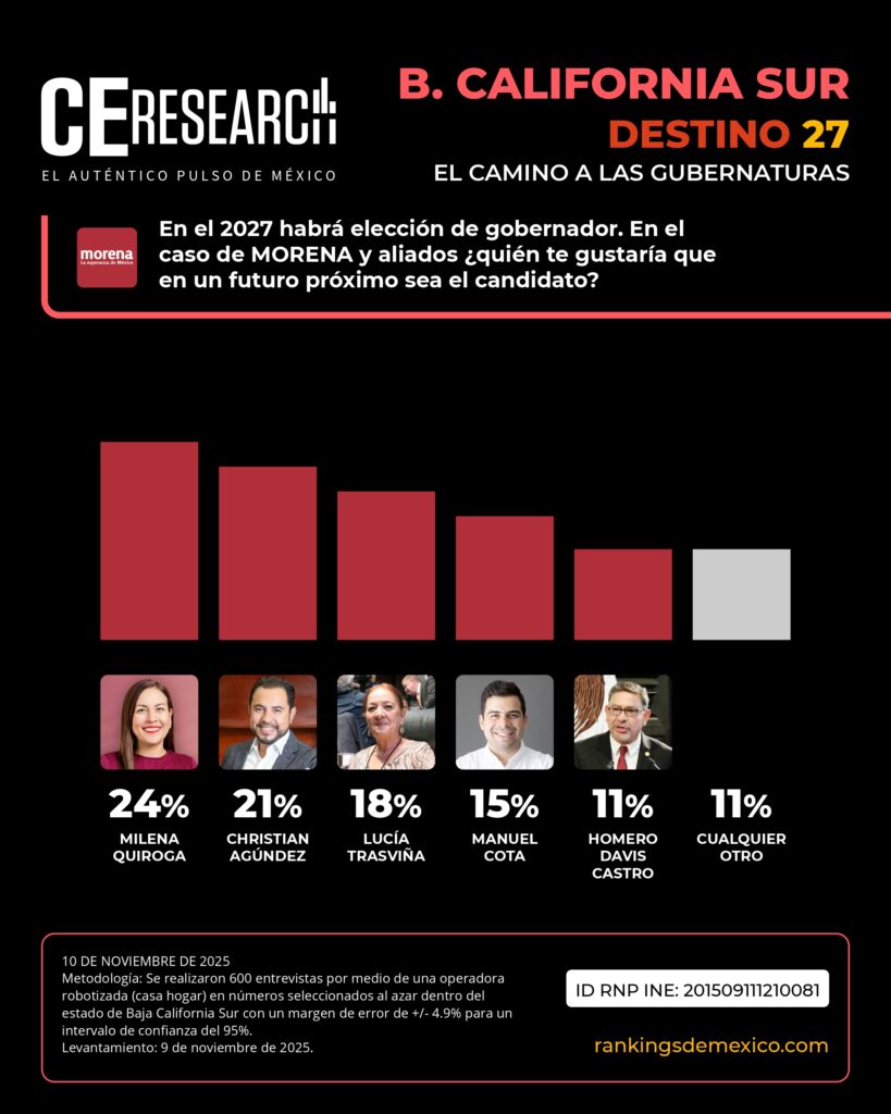 La contienda por la gubernatura de Baja California Sur comienza a perfilar una competencia reñida. De acuerdo con la encuesta estatal Destino 27 elaborada por la encuestadora de esta casa editorial, CE Research, la alcaldesa de La Paz, Milena Quiroga, se coloca como la figura más fuerte dentro y fuera de MORENA rumbo a la elección de 2027.