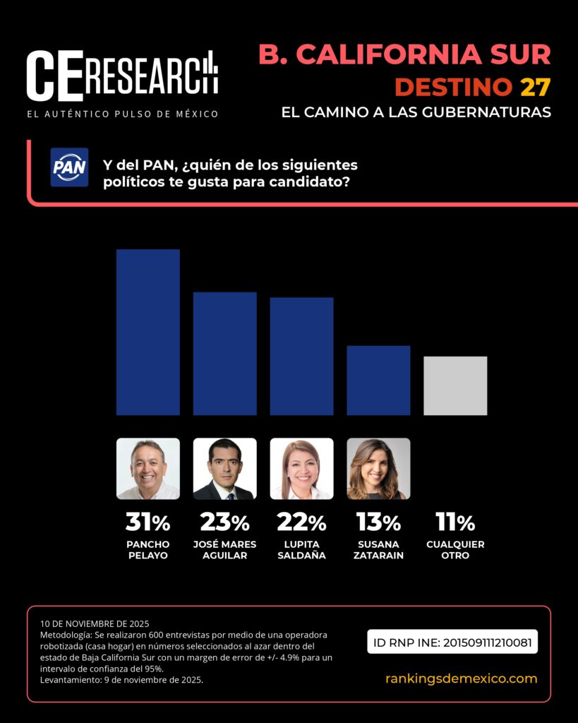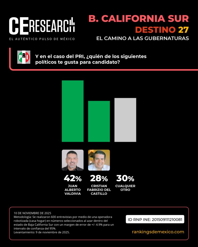 Dentro del partido guinda, Quiroga encabeza las preferencias con 24% de apoyo, seguida muy de cerca por el alcalde de Los Cabos, Christian Agúndez, quien alcanza 21%, apenas tres puntos abajo. Más atrás aparecen los legisladores federales Lucía Trasviña con 18%, Manuel Cota con 15% y Homero Davis Castro con 11%. El 11% restante mencionó que preferiría a cualquier otro.