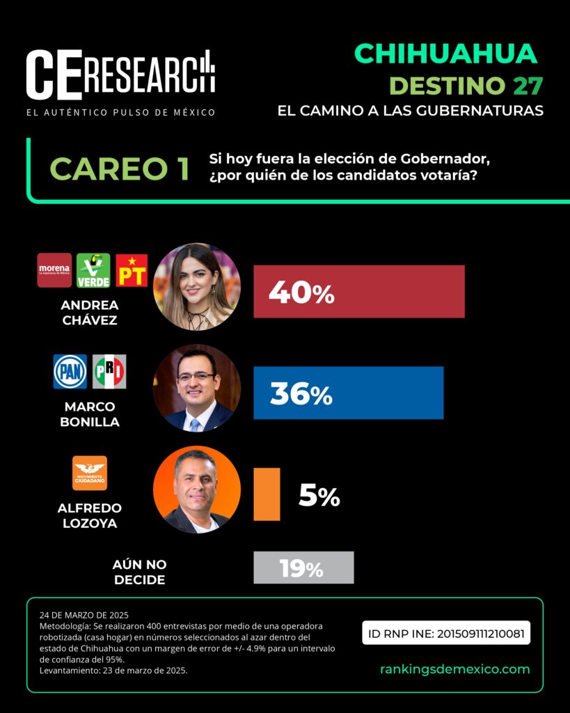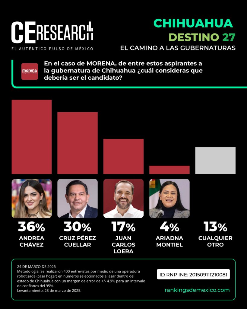 En MORENA, la senadora Andrea Chávez aventaja por 6 puntos al alcalde de Ciudad Juárez Cruz Pérez Cuellar.