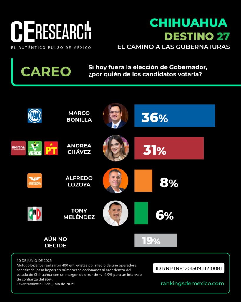 CE Research. 10 de junio 2025.- Es uno de los estados que prometen tener una contienda cerrada. La marca MORENA es apenas superior a la del PAN, pero cuando se ponen rostros de candidatos a cada partido, la matemática cambia y el candidato panista Marco Bonilla -sin alianza con el PRI- le ganaría ahora mismo a la senadora Andrea Chávez.