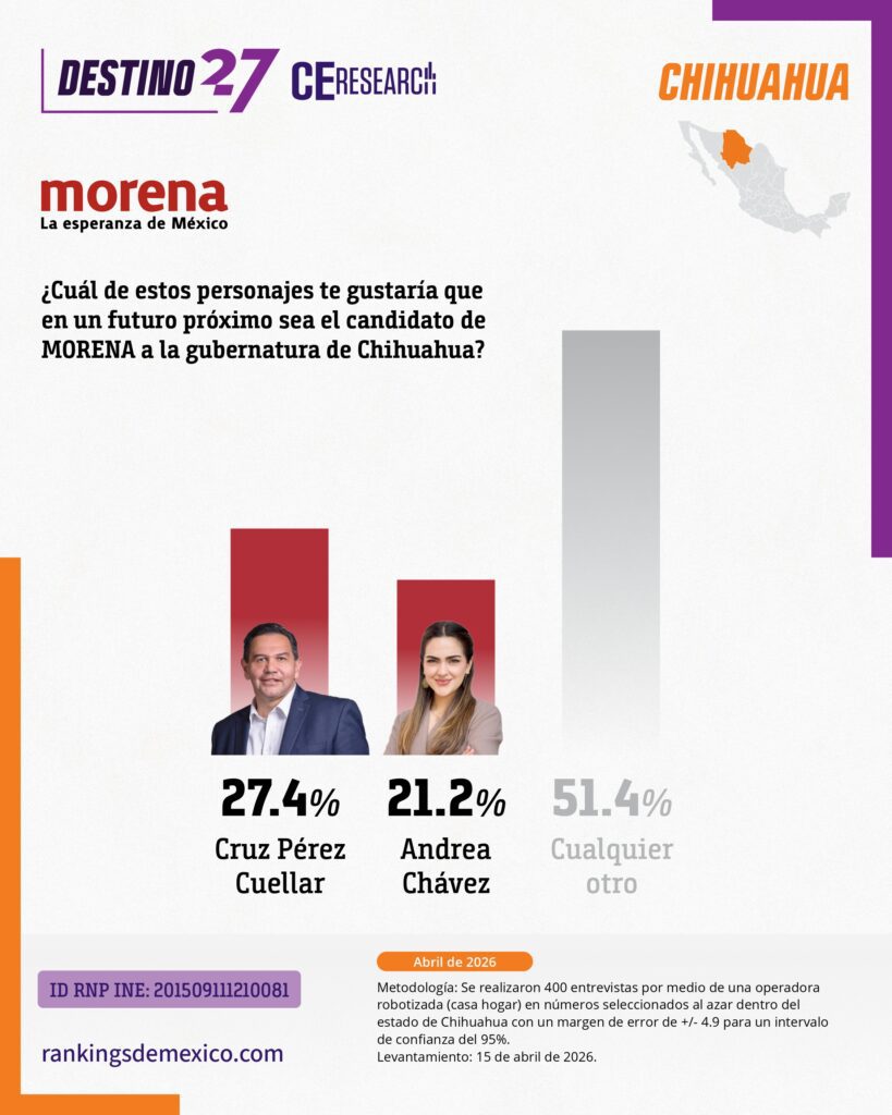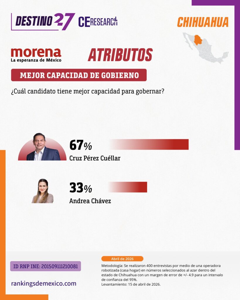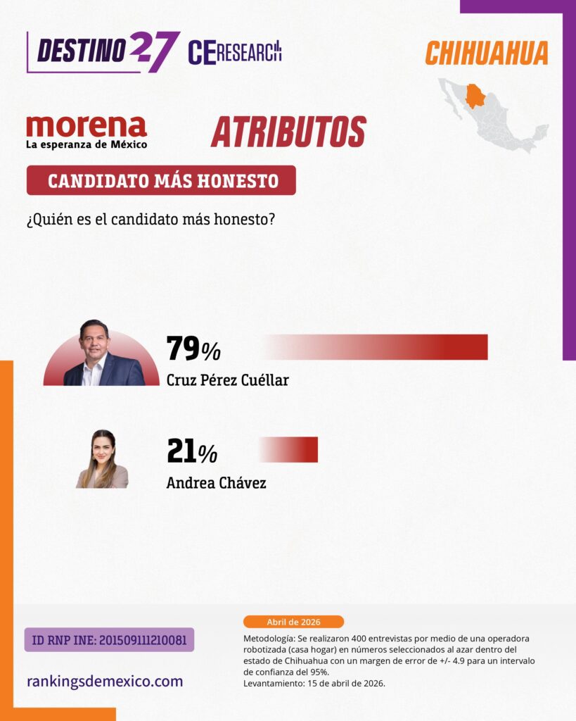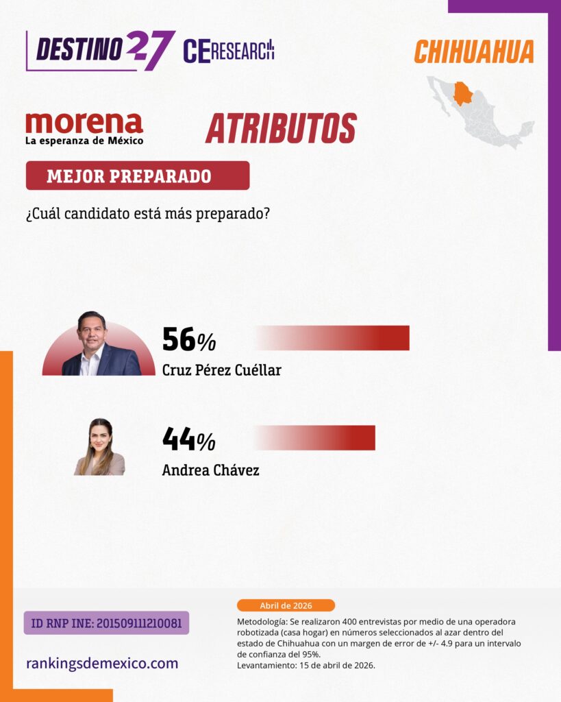 CE Research. 16 de abril 2026.- Cruz Pérez Cuéllar es el favorito de los chihuahuenses para ser el candidato de MORENA a la gubernatura, superando a la ahora senadora con licencia, Andrea Chávez, tanto en preferencia general como en 3 de los 4 atributos que mide MORENA para nombrar aspirantes.