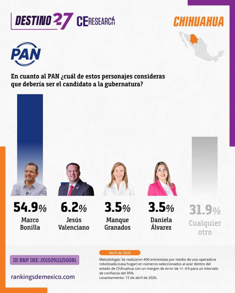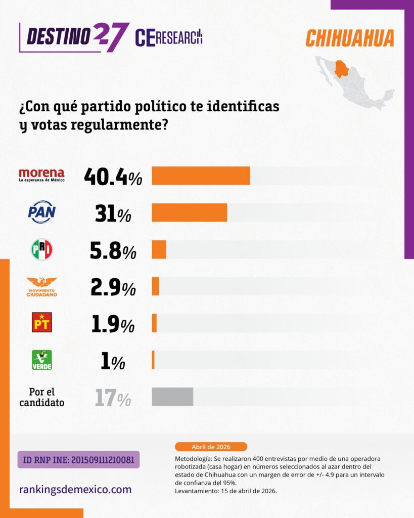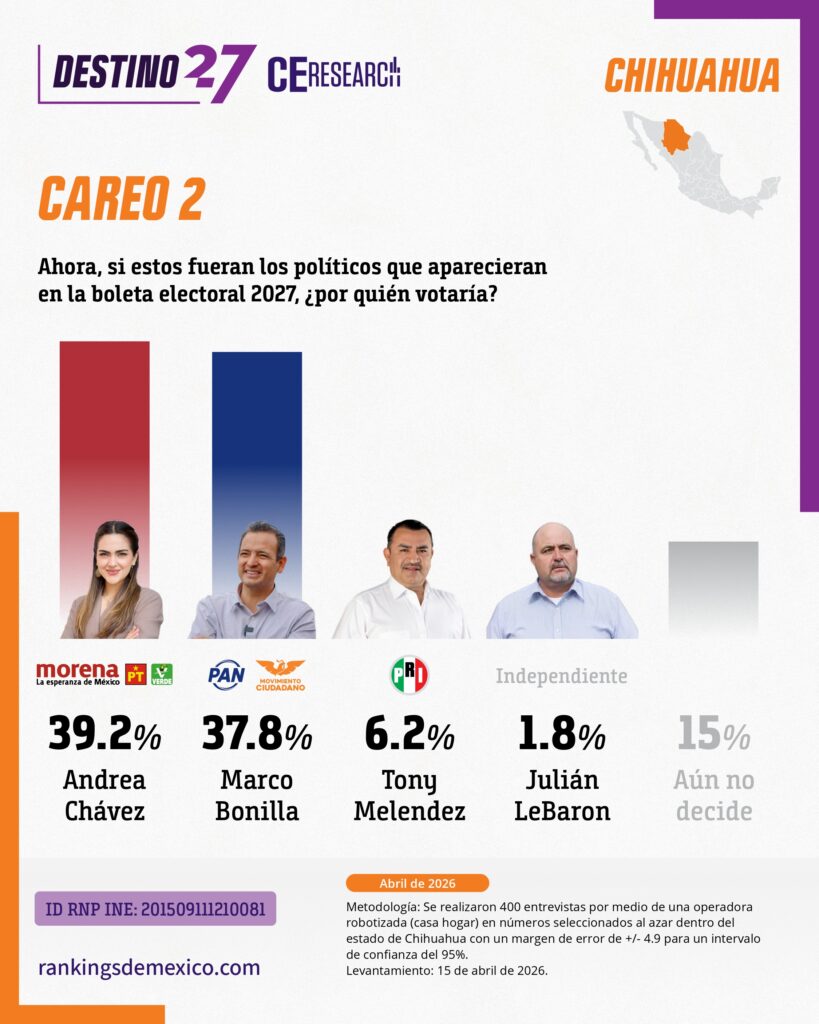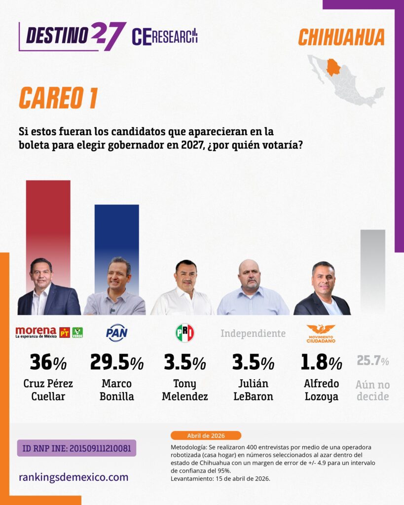 CE Research. 16 de abril 2026.- Cruz Pérez Cuéllar es el favorito de los chihuahuenses para ser el candidato de MORENA a la gubernatura, superando a la ahora senadora con licencia, Andrea Chávez, tanto en preferencia general como en 3 de los 4 atributos que mide MORENA para nombrar aspirantes.