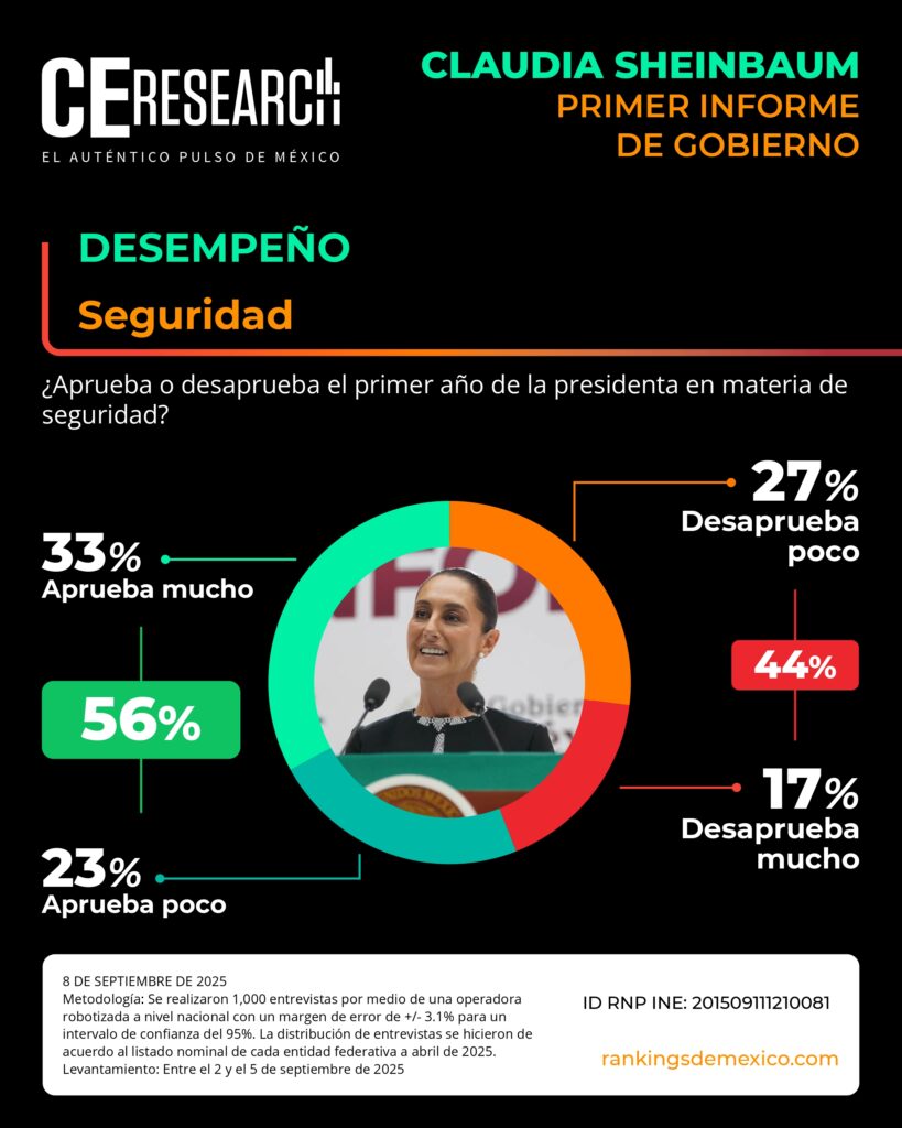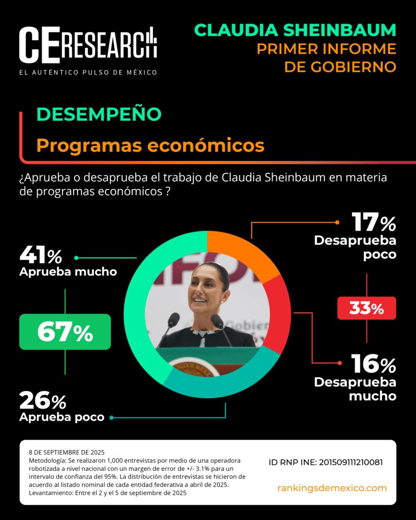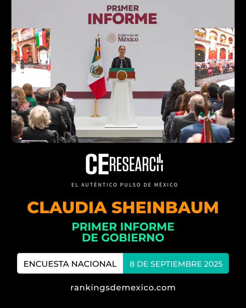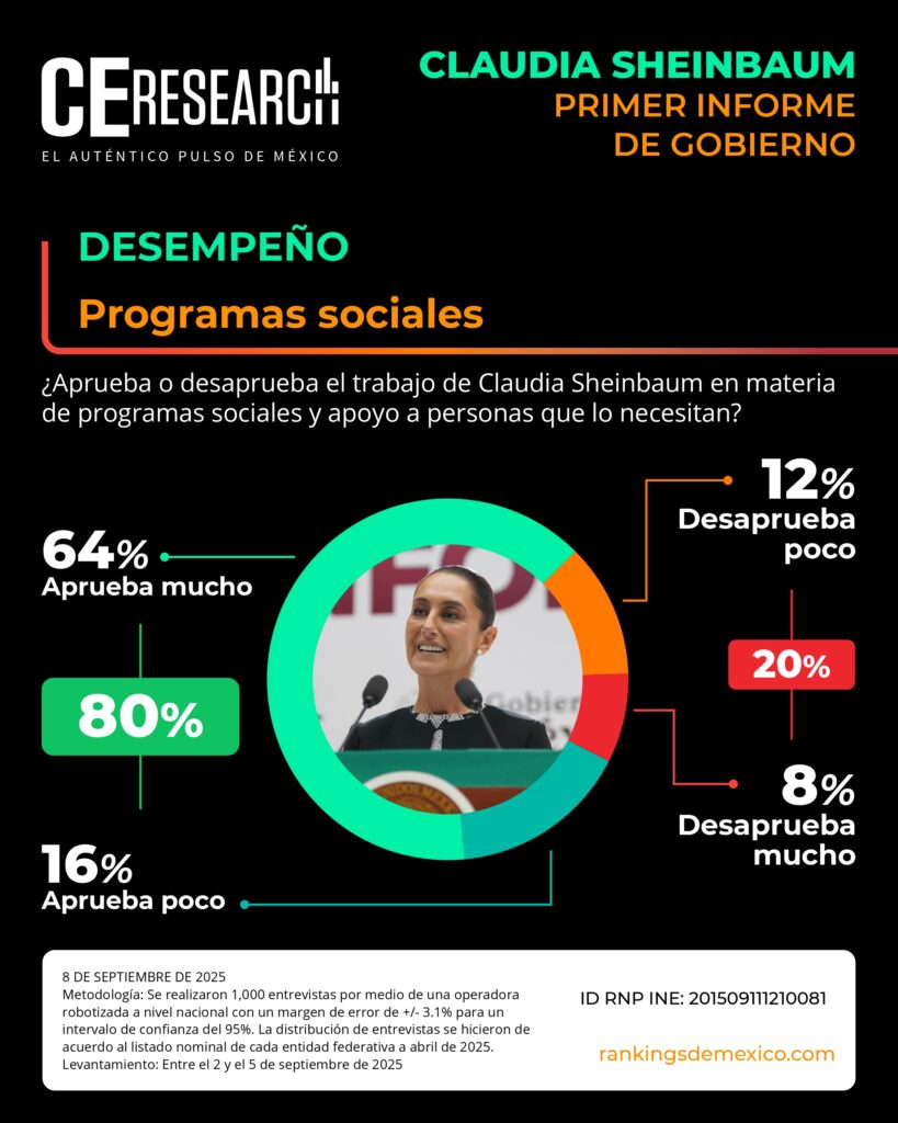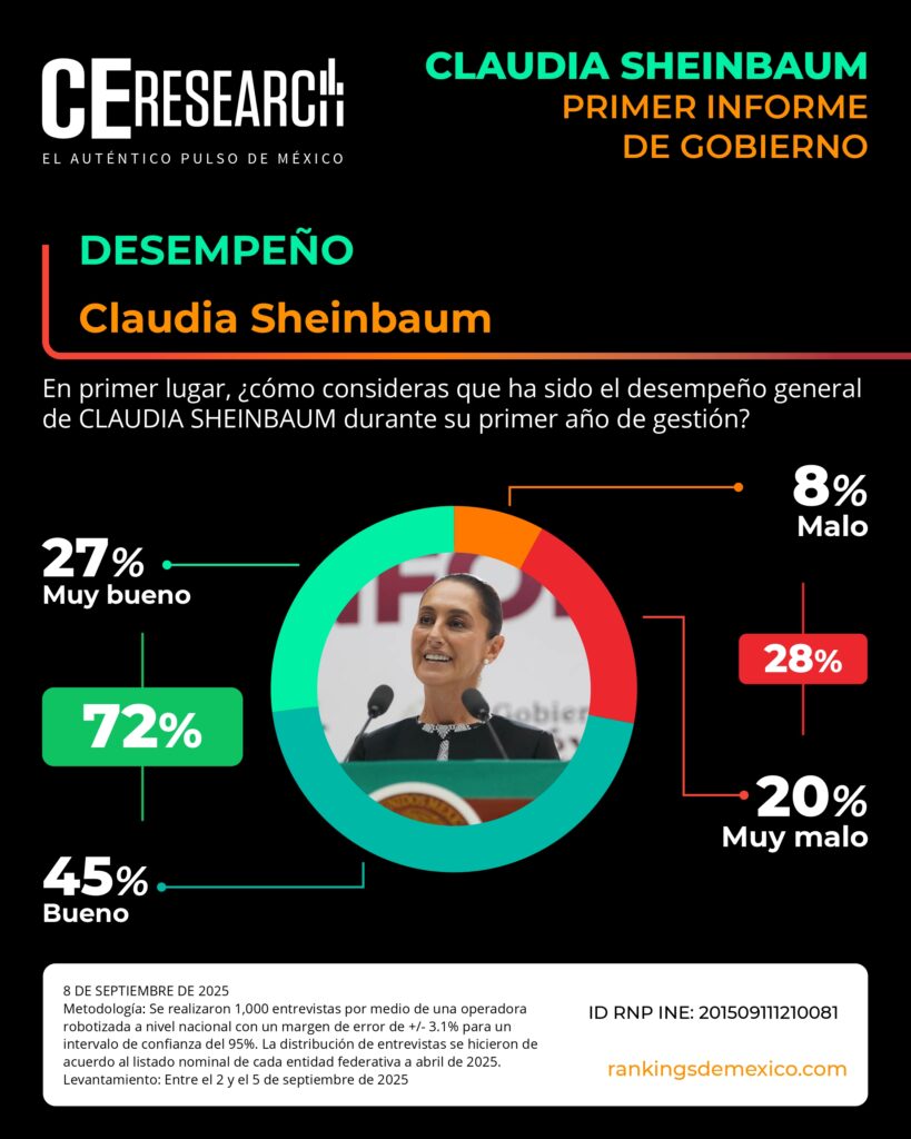 CE Research. 08 de septiembre de 2025.- A unos días de haber dado su primer informe de gobierno, la presidenta Claudia Sheinbaum no solo llega con el 72% de aprobación, sino que además aprueba en seguridad, programas sociales de apoyo, economía y programas contra la corrupción.
