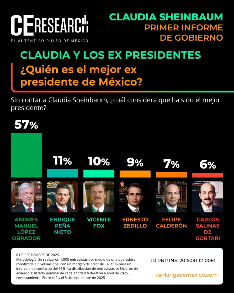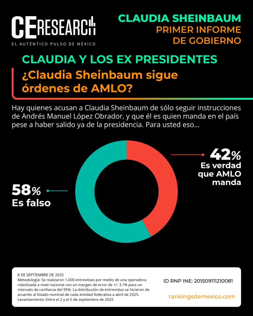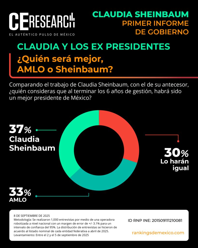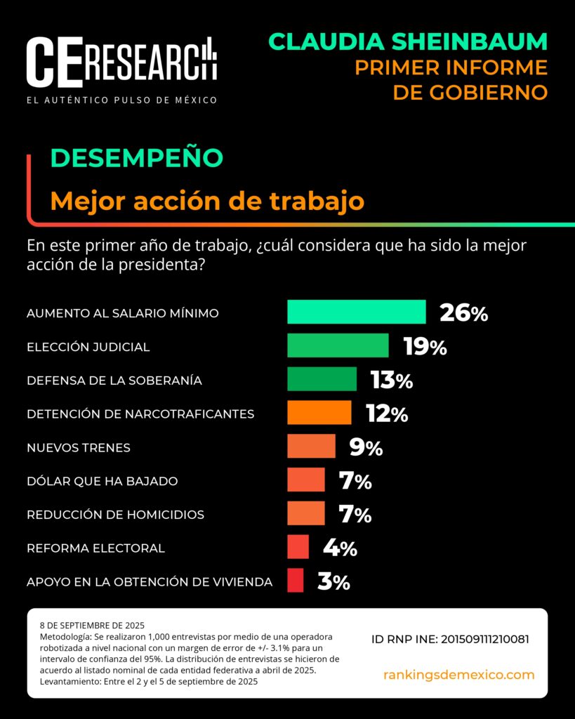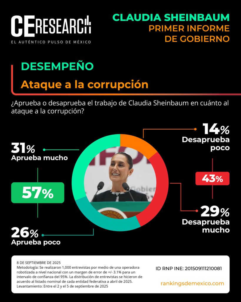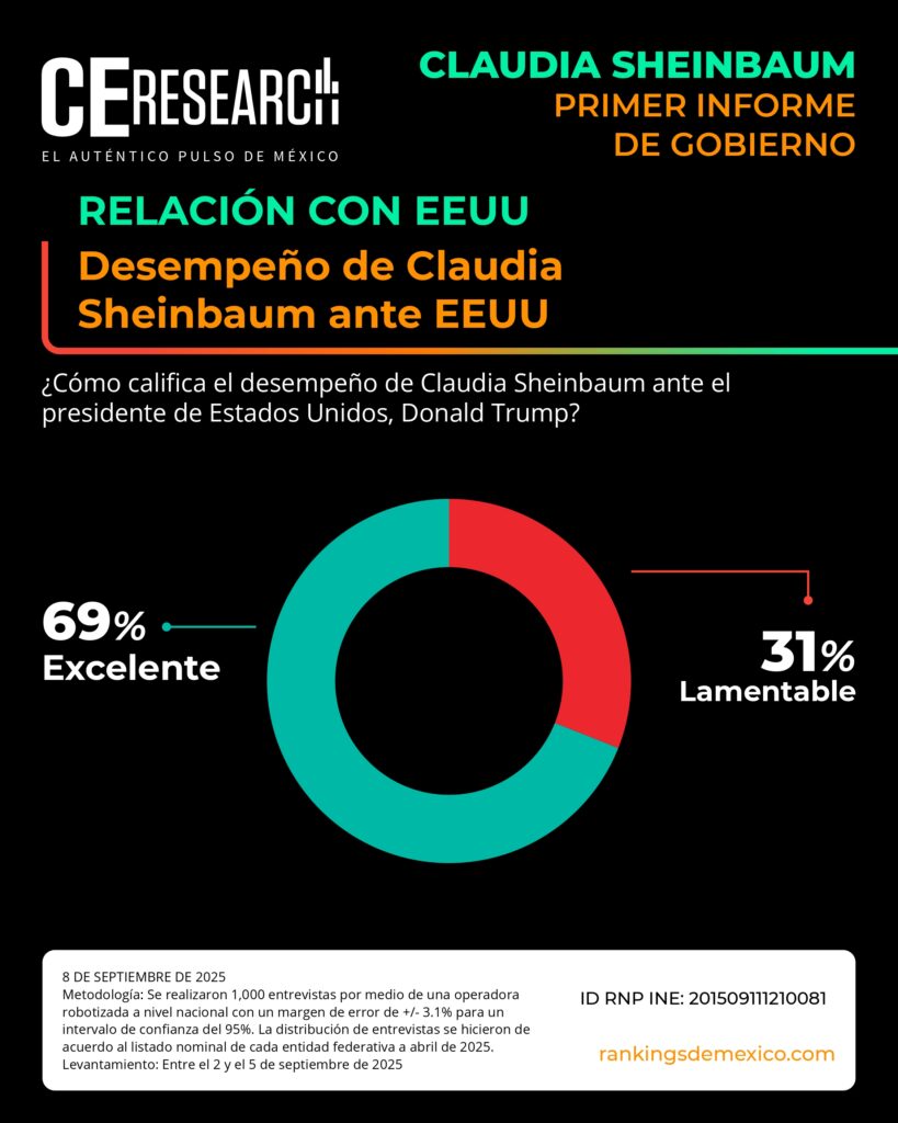 CE Research. 08 de septiembre de 2025.- A unos días de haber dado su primer informe de gobierno, la presidenta Claudia Sheinbaum no solo llega con el 72% de aprobación, sino que además aprueba en seguridad, programas sociales de apoyo, economía y programas contra la corrupción.