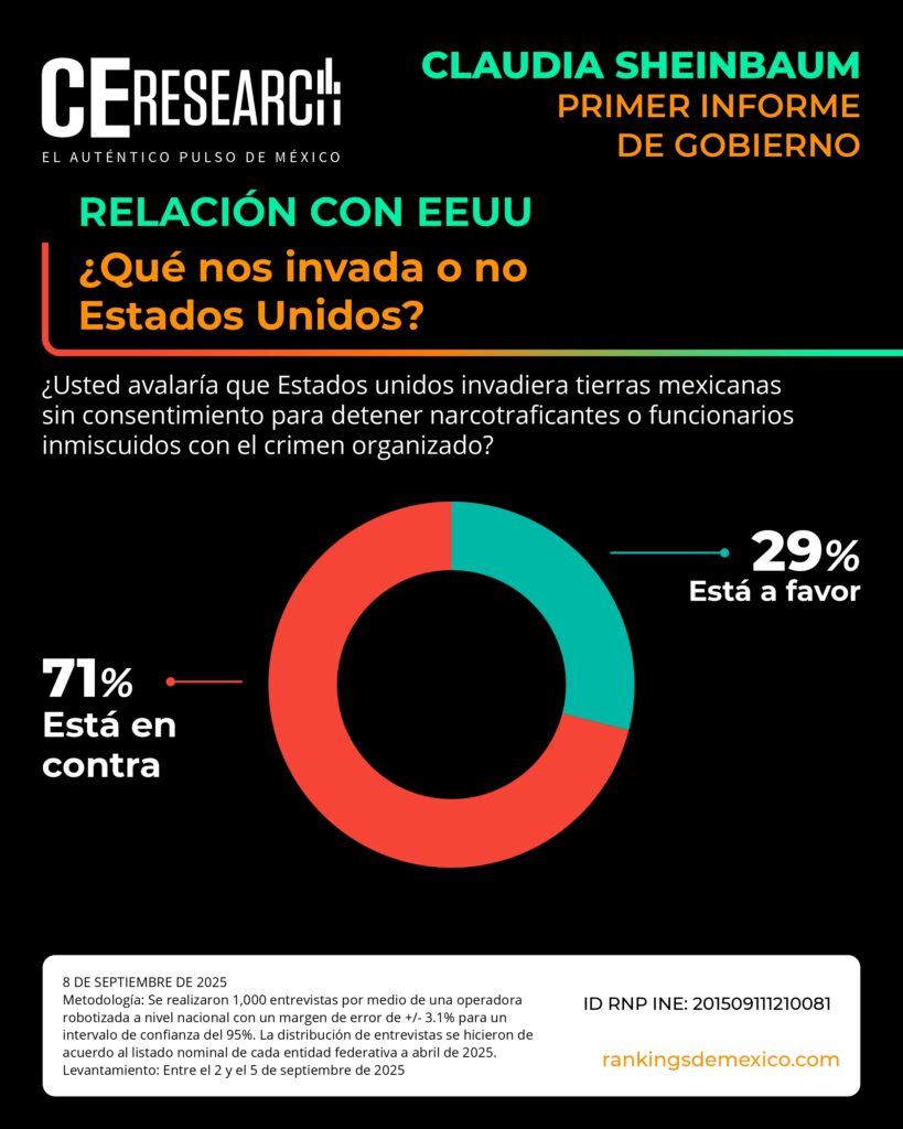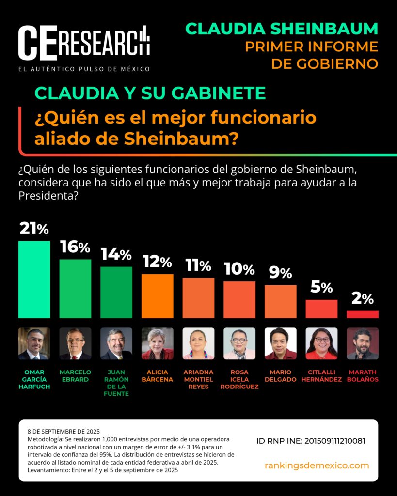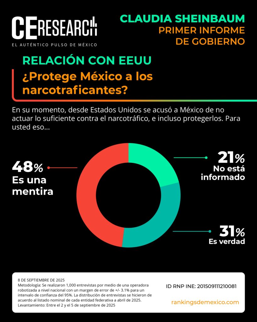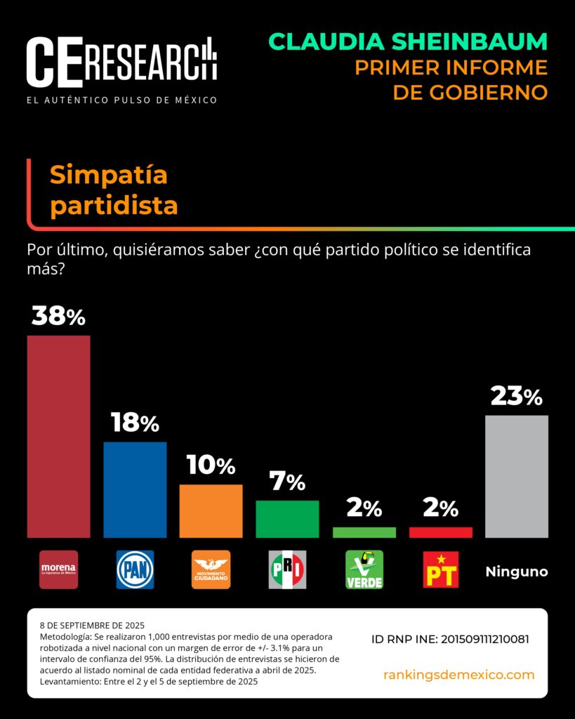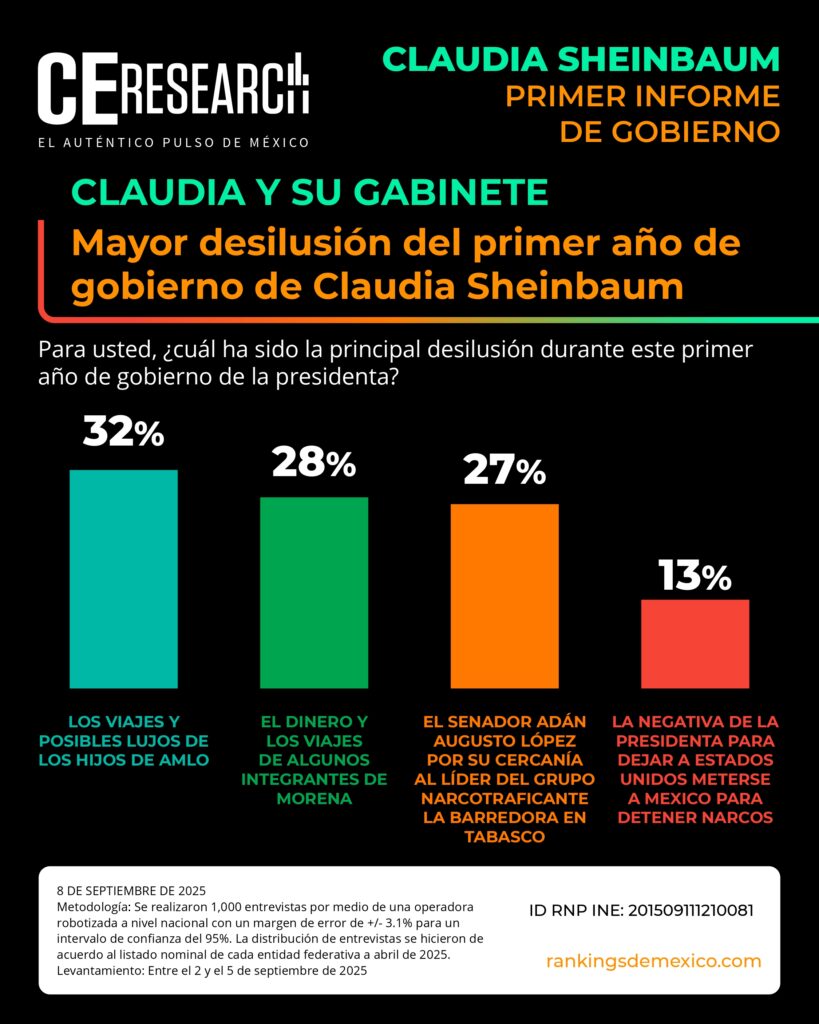 CE Research. 08 de septiembre de 2025.- A unos días de haber dado su primer informe de gobierno, la presidenta Claudia Sheinbaum no solo llega con el 72% de aprobación, sino que además aprueba en seguridad, programas sociales de apoyo, economía y programas contra la corrupción.