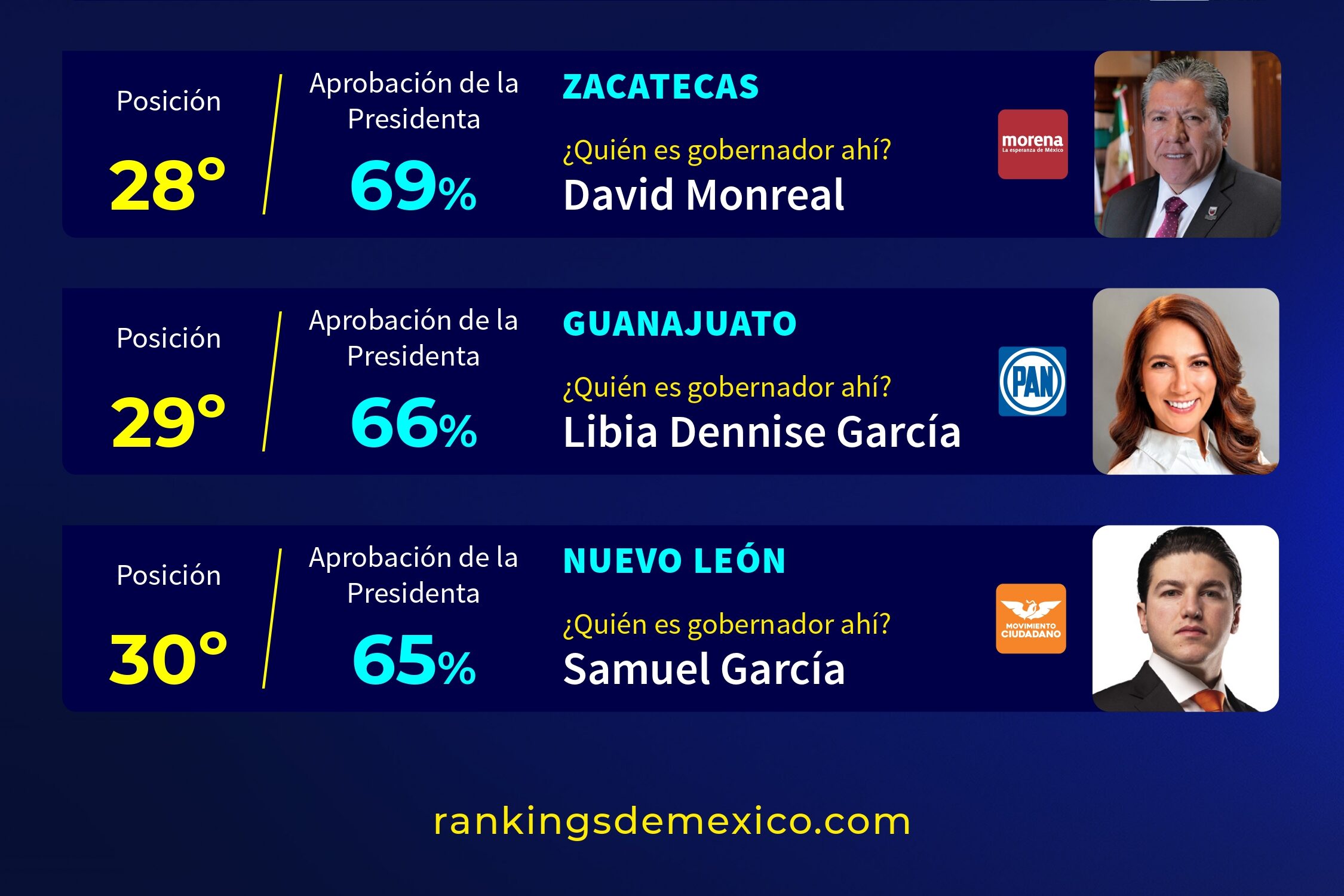 Los estados donde la presidenta tiene la aprobación más baja son aquellos gobernador por la oposición y lo encabeza Aguascalientes de la gobernadora panista Tere Jiménez con 63%; seguido de Jalisco (Movimiento Ciudadano) con 64%; Nuevo León (Movimiento Ciudadano) con 65% y Guanajuato (PAN) con 66%.