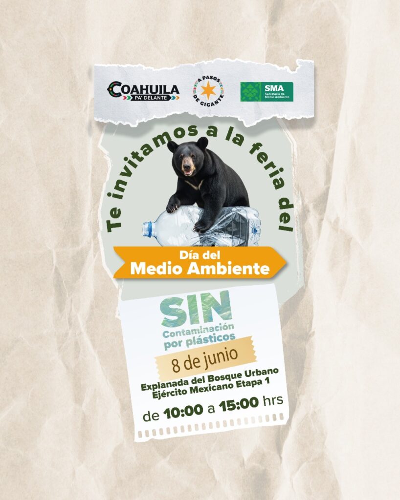 Saltillo, Coahuila. 04 de junio del 2025.— En el marco del Día Mundial del Medio Ambiente, que se celebra el 5 de junio, el Gobierno del Estado de Coahuila, a través de la Secretaría de Medio Ambiente (SMA), llevará a cabo una feria temática el próximo 8 de junio, en la Explanada del Bosque Urbano Ejército Mexicano, Etapa 1, en un horario de 10:00 a 15:00 horas.