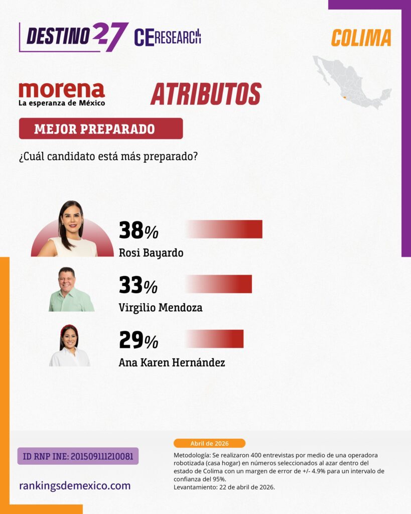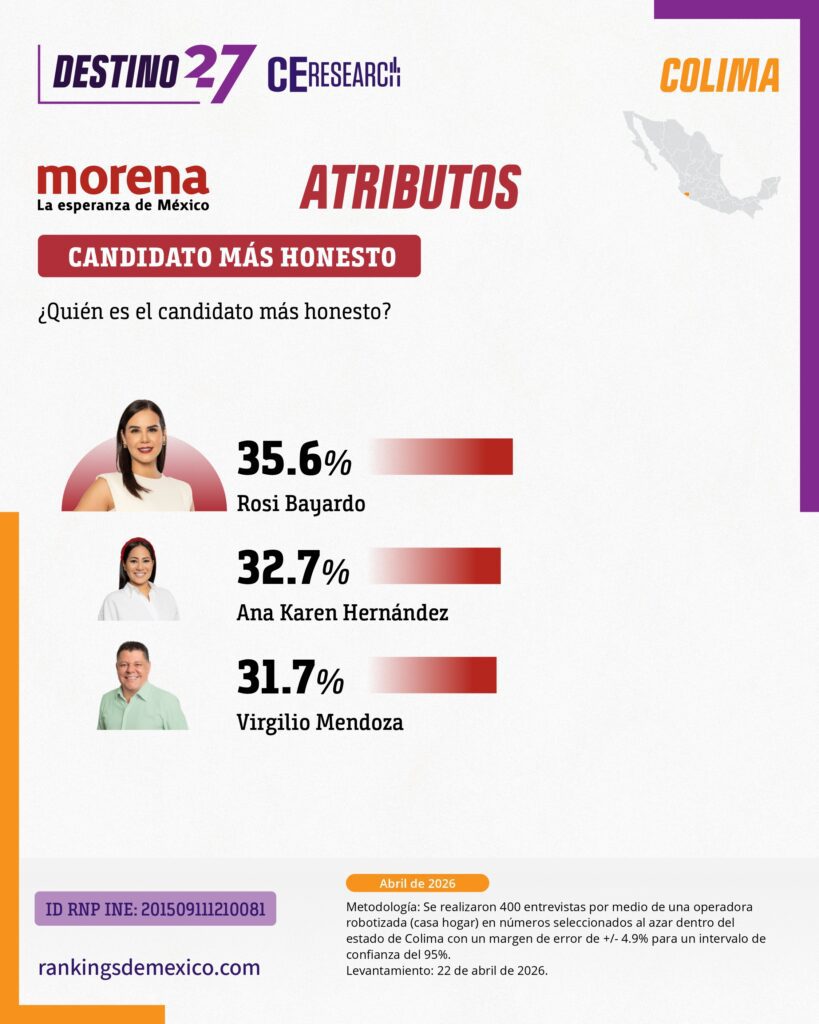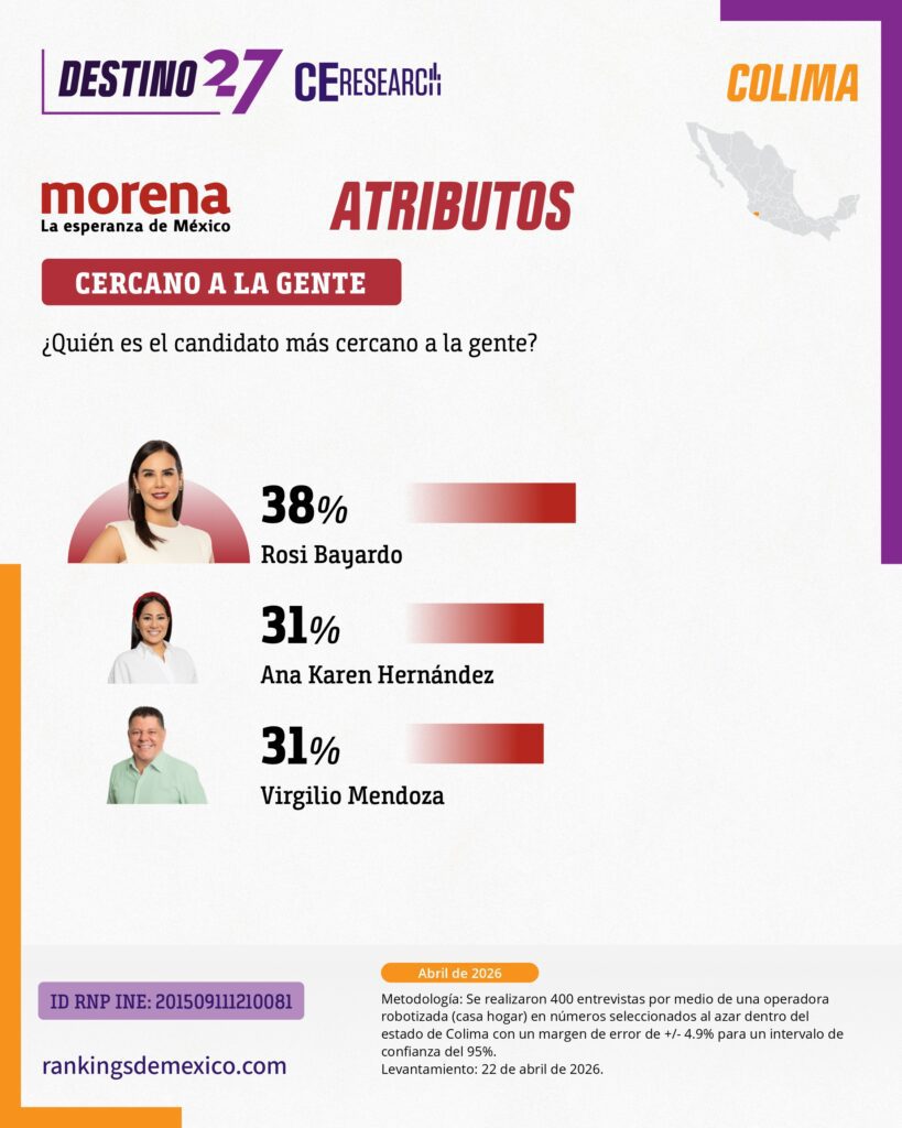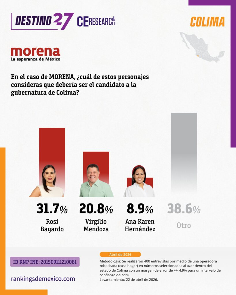 CE Research. 23 de abril 2026.- La alcaldesa de Colima capital, Rosy Bayardo camina con una cómoda ventaja en la lucha interna de MORENA por hacerse de la candidatura al gobierno del estado.