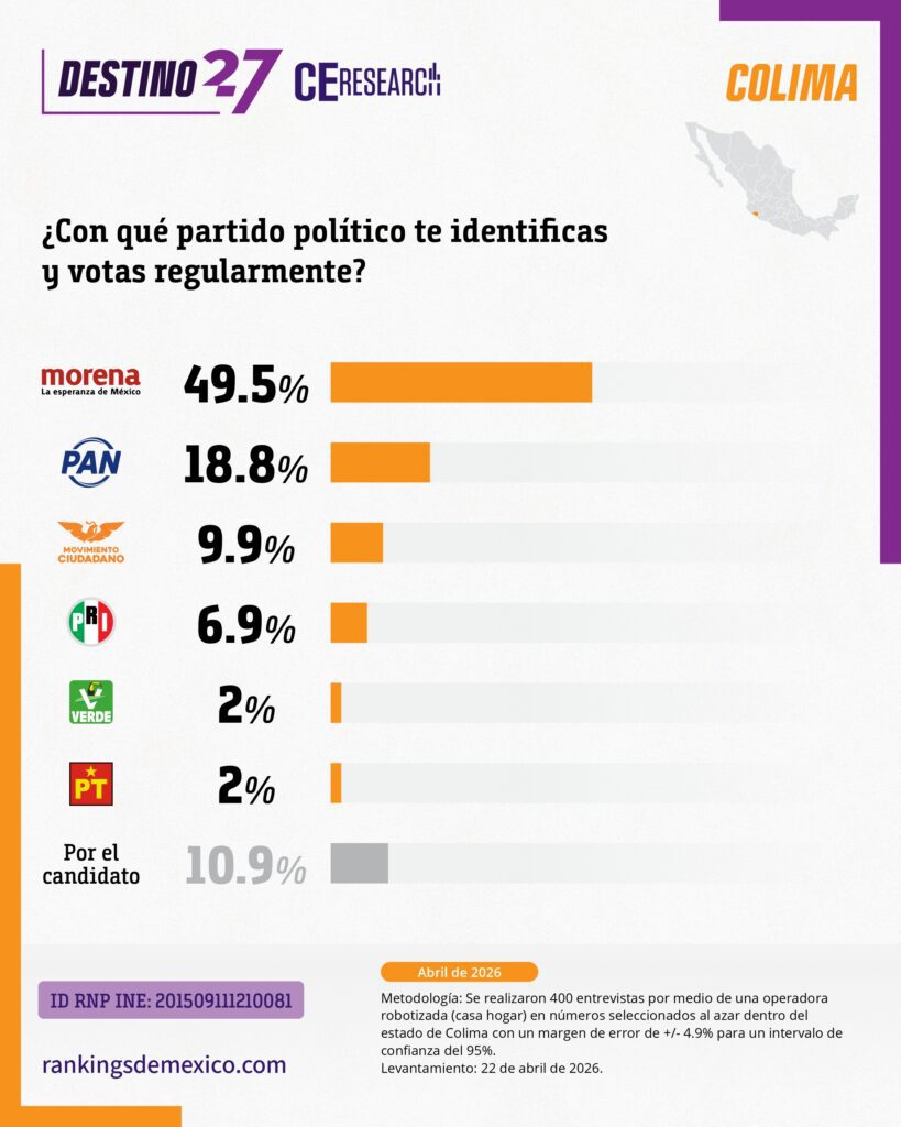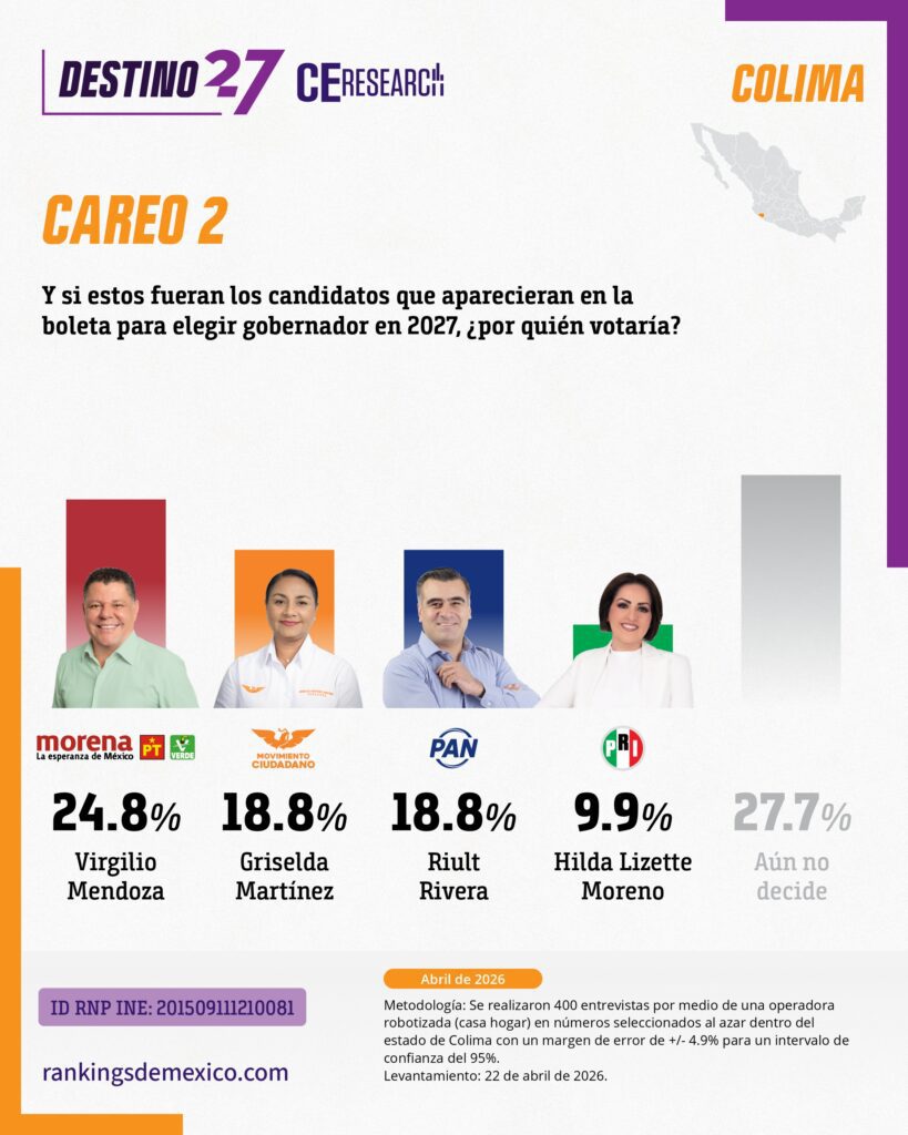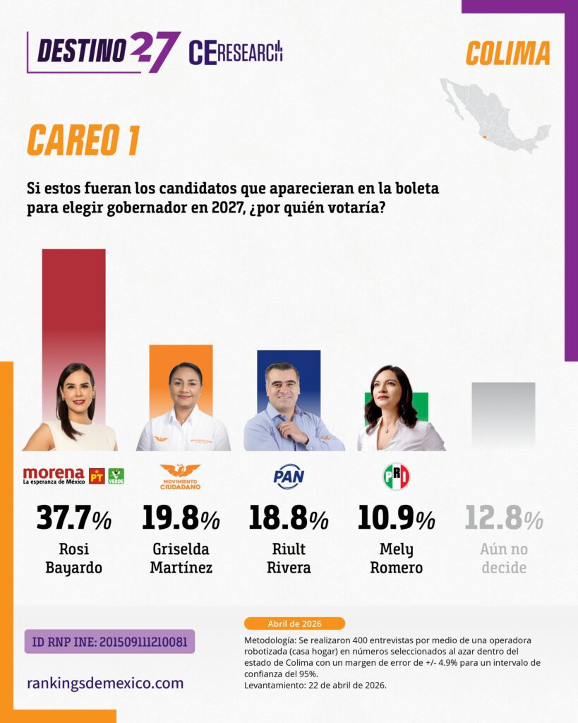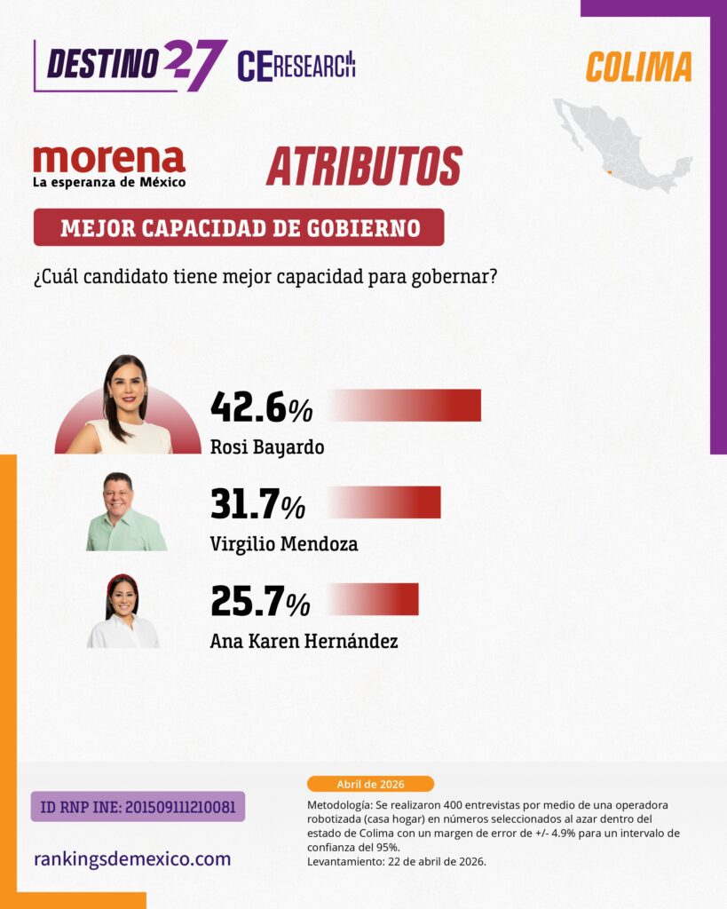 CE Research. 23 de abril 2026.- La alcaldesa de Colima capital, Rosy Bayardo camina con una cómoda ventaja en la lucha interna de MORENA por hacerse de la candidatura al gobierno del estado.