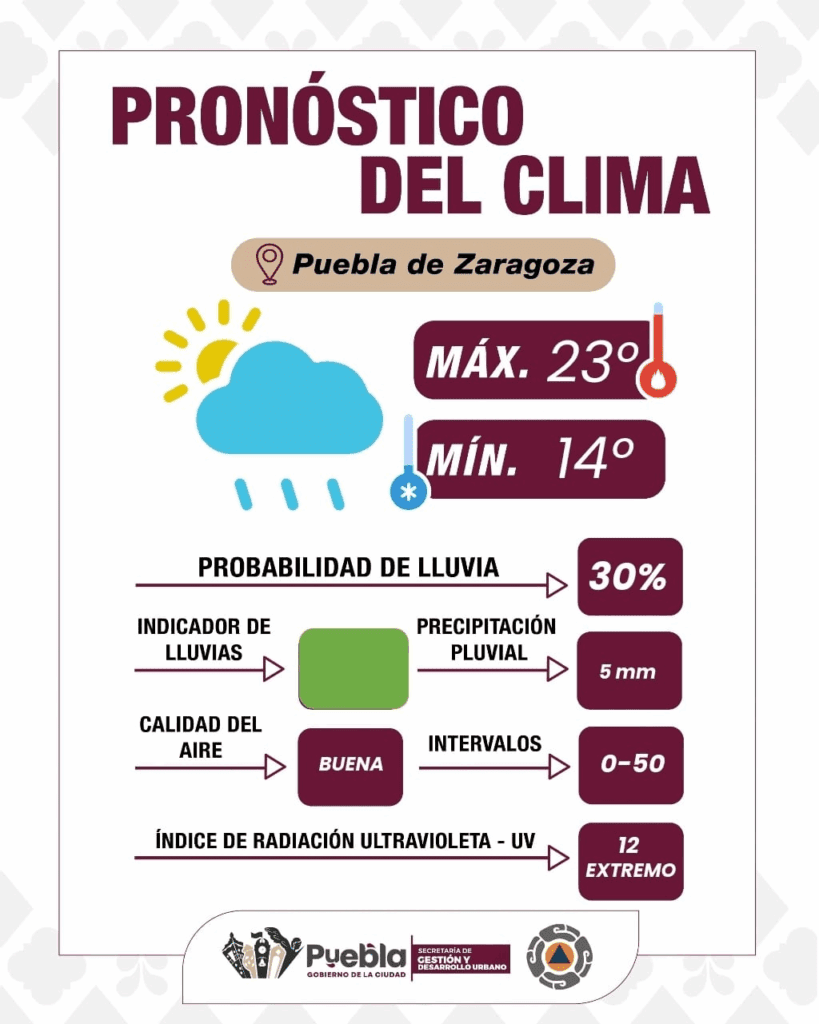 Puebla, Pue., a 25 de septiembre de 2025 El Gobierno de la Ciudad informa que este jueves se prevé un día parcialmente nublado, con una baja probabilidad de lluvias durante la tarde, las cuales podrían dejar acumulaciones entre 0 y 5 mm. La temperatura máxima alcanzará los 23°C, mientras que la mínima será de 14°C. Se recomienda a la ciudadanía tomar precauciones ante un índice UV extremo, por lo que es fundamental proteger la piel si se realizan actividades al aire libre.