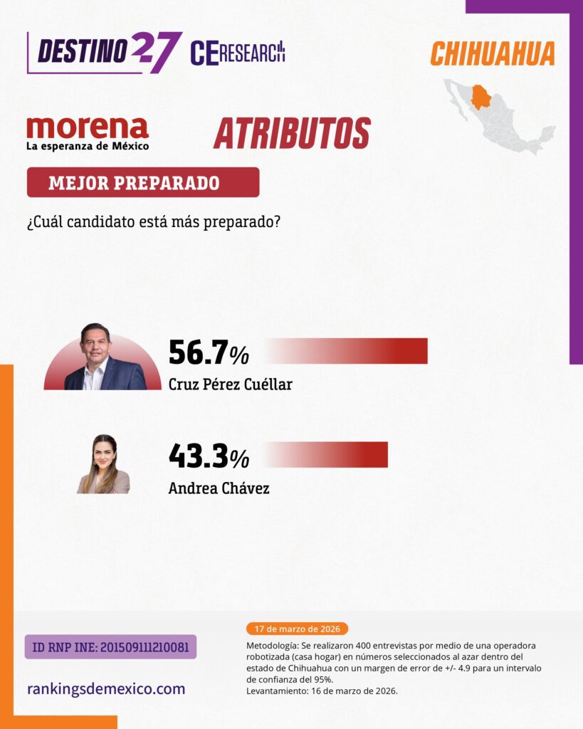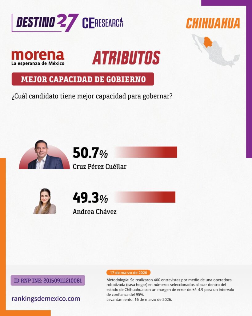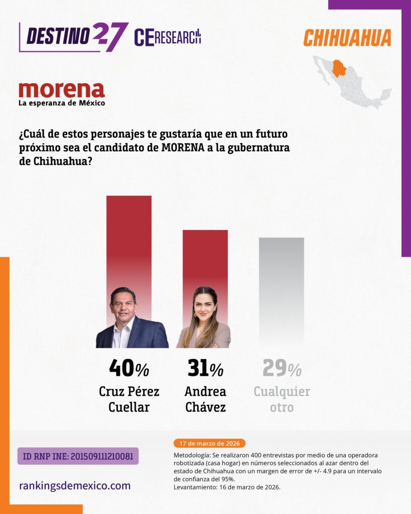 Cruz Pérez Cuéllar se perfila como el favorito de los chihuahuenses para convertirse en el candidato de Morena a la gubernatura. El alcalde de Ciudad Juárez encabeza las preferencias internas del partido y se muestra competitivo en posibles escenarios electorales rumbo al próximo año de acuerdo con Destino 27, sondeo elaborado por CE Research, encuestadora de esta casa editorial.