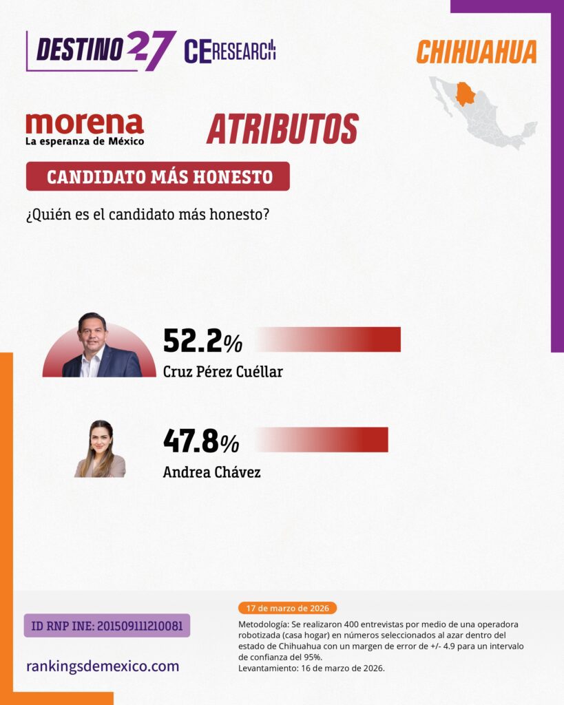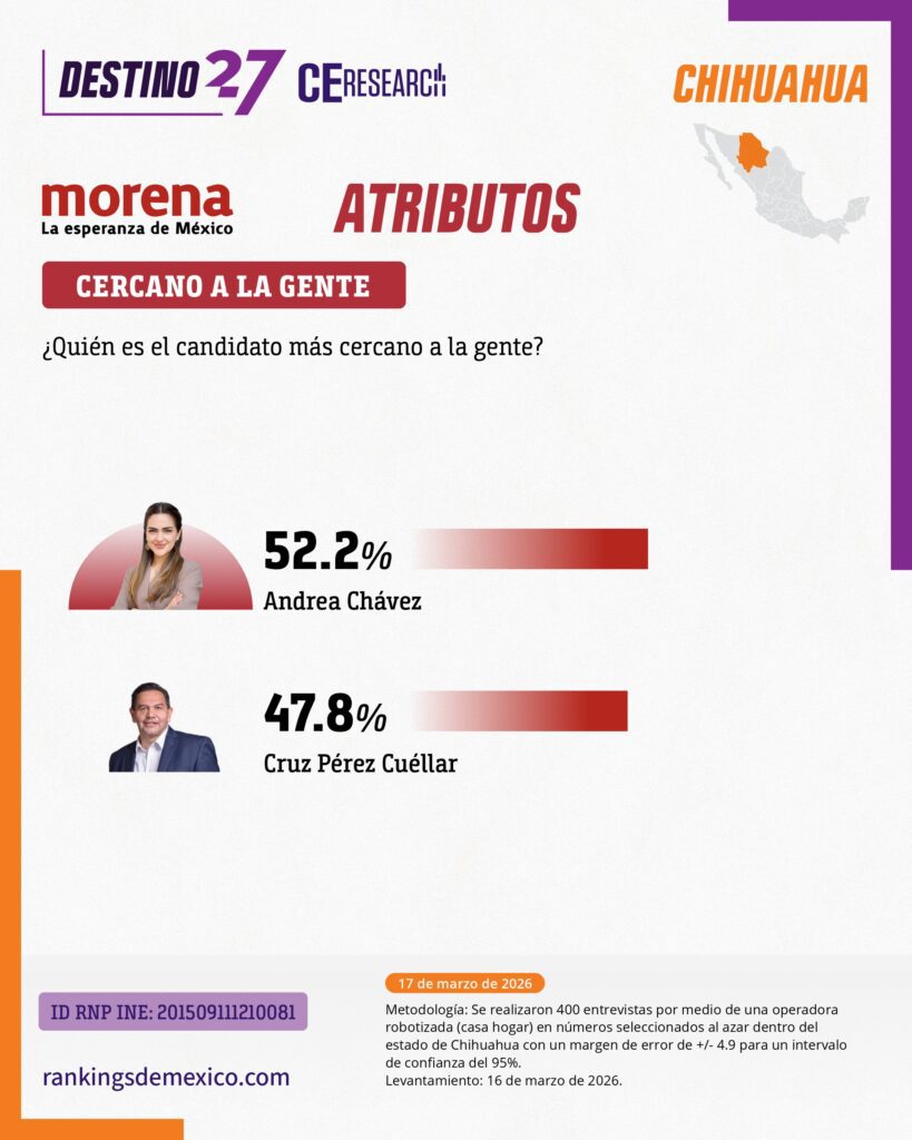 En la evaluación por atributos también supera a la senadora en tres de ellos: honestidad (52.2%), preparación (56.7%) y capacidad para gobernar (50.7%). Chávez es considerada por el 52.2% de los encuestados como la más cercana a la gente.