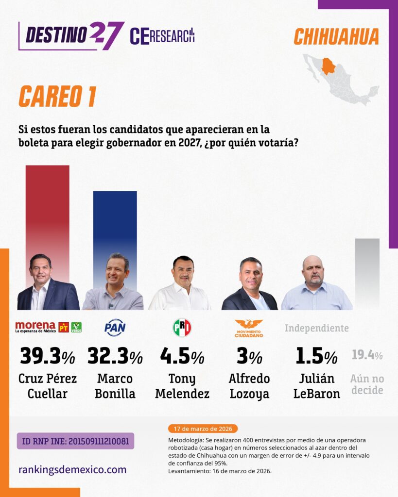 En un primer careo rumbo a la elección, Cruz Pérez obtiene el 39.3% de la intención de voto, superando al alcalde panista de Chihuahua, Marco Bonilla -el mejor posicionado dentro de su partido para ser el candidato-, quien registra el 32.3%. En este escenario, el 19.4% de los encuestados aún no decide su voto.