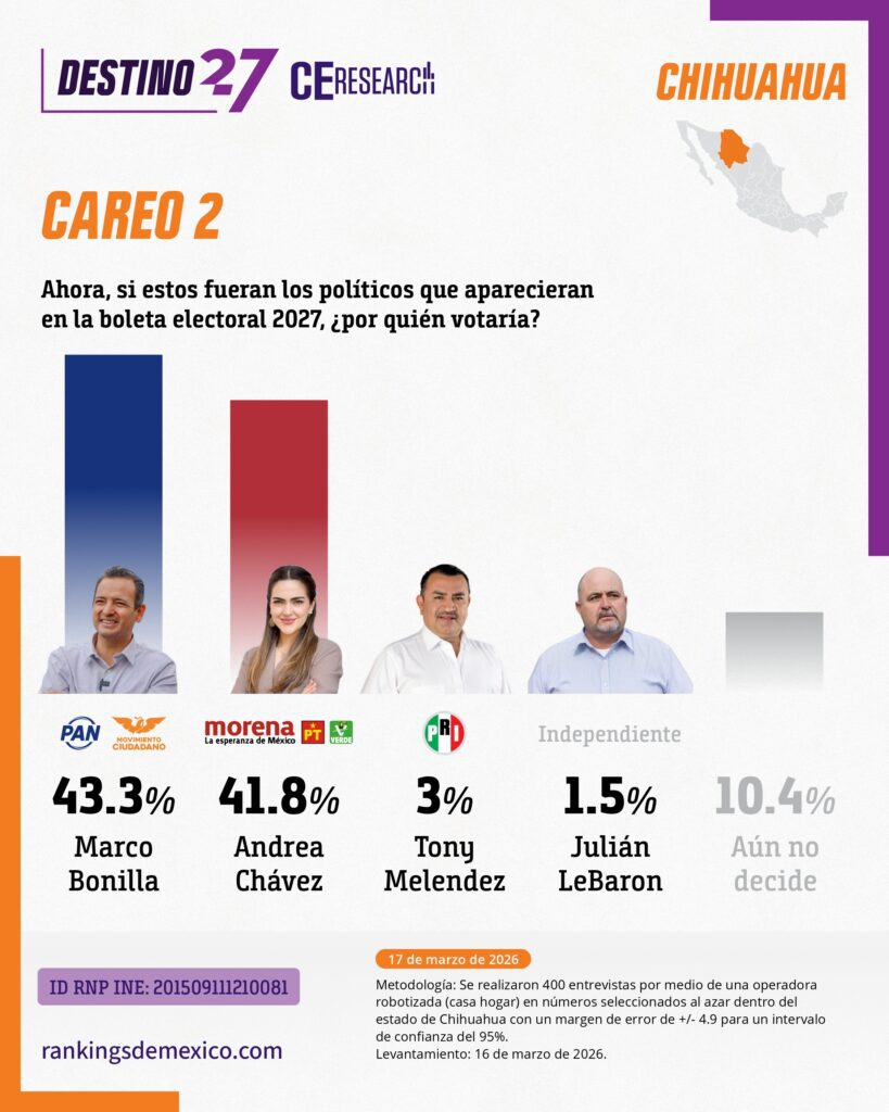 En contraste, cuando la candidata de Morena es Andrea Chávez, Bonilla alcanza el 43.3% de las preferencias, mientras que Chávez obtiene el 41.8%, con una diferencia de poco más de un punto porcentual entre ambos.