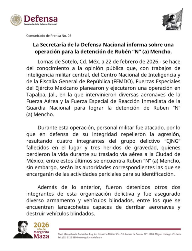 Fuerzas federales mexicanas ejecutaron esta madrugada un operativo en Tapalpa, Jalisco, en el que Nemesio Rubén Oseguera Cervantes, alias “El Mencho”, líder fundador y máximo cabecilla del Cártel Jalisco Nueva Generación (CJNG), murió abatido después de un enfrentamiento con elementos militares.