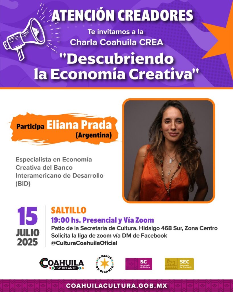 Saltillo, Coahuila, 11 de julio de 2025.– Como parte de los esfuerzos para fortalecer la economía creativa en el estado, la Secretaría de Cultura de Coahuila, en coordinación con la Secretaría de Economía, invita a la charla “Descubriendo la Economía Creativa”, que se llevará a cabo el próximo 15 de julio a las 19:00 horas en el patio de la Secretaría de Cultura (Hidalgo 468 Sur, Zona Centro, Saltillo), con participación presencial y vía Zoom.