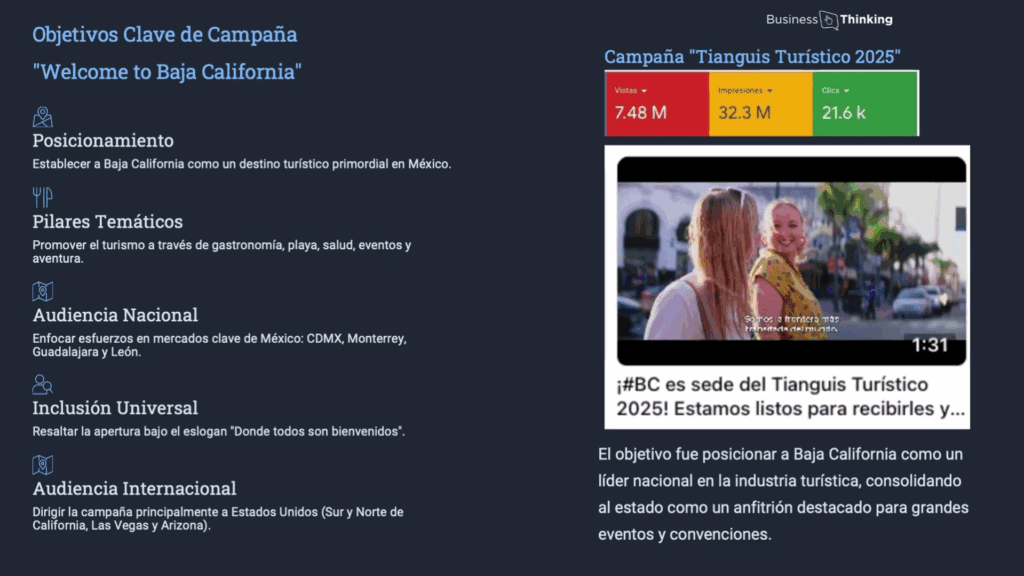 De acuerdo con Jorge, las redes sociales clave para el turismo son Facebook, Instagram y YouTube, y con sus altos índices de uso tanto por mexicanos como estadounidenses fueron las redes estratégicas para dirigir el tráfico hacia páginas de reserva y promover la interacción directa con la campaña, mientras que YouTube sirvió para el contenido tanto en formato largo como Shorts. El manejo analítico de estas plataformas permitió adaptar el contenido según la demografía, intereses y comportamientos, logrando así una marca tan fructífera que fue utilizada para presentar a Baja California en el Tianguis Turístico 2025.