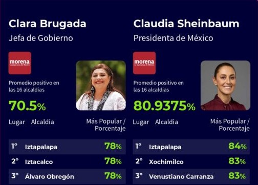 De igual forma, la jefa de gobierno de la Ciudad de México, Clara Brugada Molina, reportó 70.5 por ciento de aprobación, con mayor simpatía en las alcaldías de Iztapalapa, Iztacalco y Álvaro Obregón.