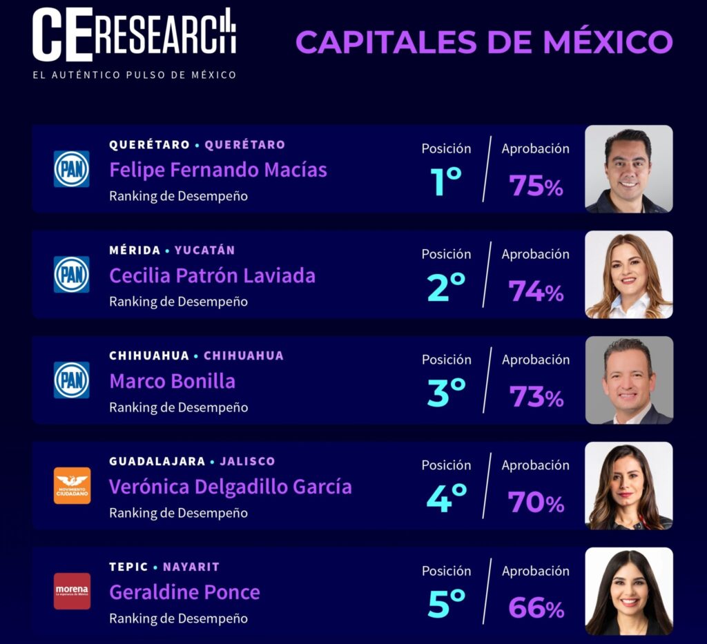 En la medición de alcaldes de ciudades capitales del país, repiten los panistas Felifer Macías, Cecilia Patrón y Marco Bonilla en primero, segundo y tercer lugar respectivamente; seguidas de la alcaldesa emecista de Guadalajara y la presidenta municipal de Tepic, Geraldine Ponce (Morena).