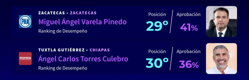 En contraste, los alcaldes con menor porcentaje de aprobación a su desempeño son los de Centro (Villahermosa), Yolanda Osuna Huerta; de Reynosa, Carlos Peña Ortiz; y Acapulco, Abelina López Rodríguez.