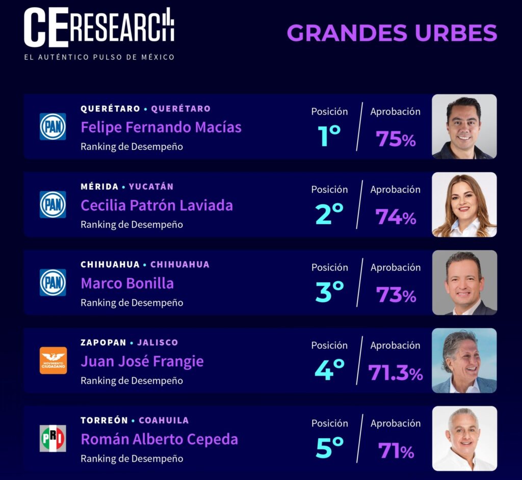 En el caso del Ranking de Alcaldes de México en grandes urbes (ciudades con más de 600 mil habitantes), el alcalde panista ocupa la primera posición y le siguen la alcaldesa de Mérida, Cecilia Patrón Laviada (PAN); de Chihuahua, Marco Bonilla (PAN); de Zapopan, Juan José Frangie (Movimiento Ciudadano); y de Torreón, Román Alberto Cepeda (PRI).