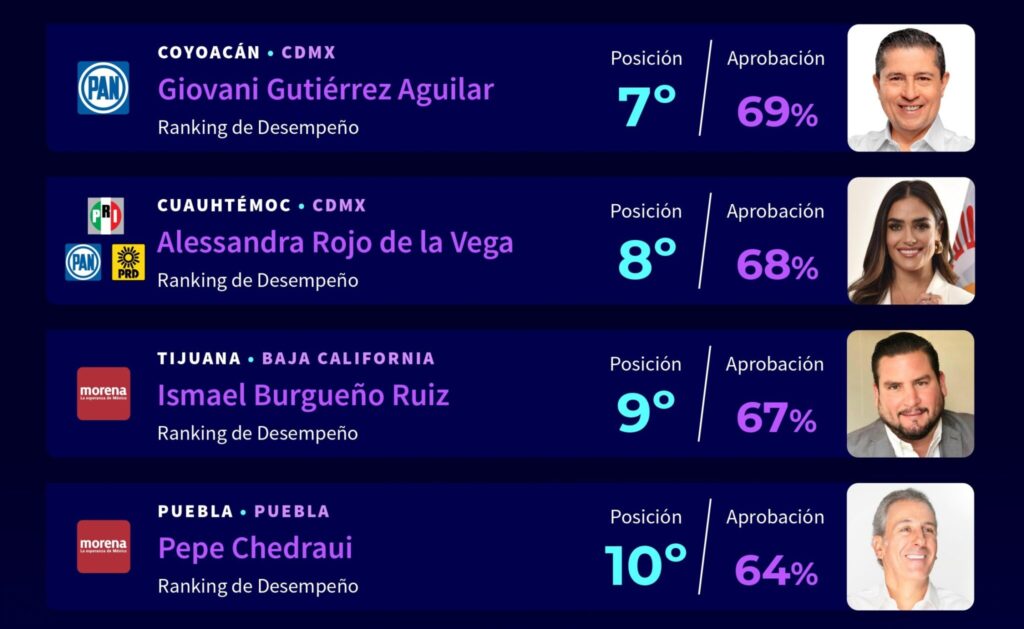 Completan el Top Ten la alcaldesa de Guadalajara, Verónica Delgadillo (Movimiento Ciudadano); de Coyoacán, Giovani Gutiérrez Aguilar (PAN); de Cuauhtémoc, Alessandra Rojo de la Vega (PRI-PAN-PRD); de Tijuana, Ismael Burgueño (Morena); y de Puebla, José Chedraui Budib (Morena).