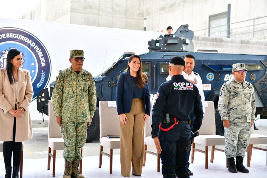 La gobernadora detalló que se entregaron dos vehículos blindados Black Mamba de 6.5 toneladas; dos Razer; armas cortas;  armas largas; cargadores; municiones; drones con cámara térmica; drones sin cámara térmica; terminales de radio móvil TPMe900 y de tipo TPH900, equipo de radiocomunicación, entre otras cosas.