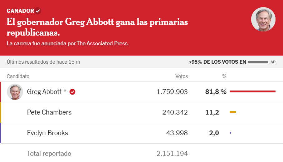 En la primaria republicana para gobernador, Greg Abbott arrasó con casi el 82% de los votos, asegurando su nominación para un cuarto mandato sin necesidad de segunda vuelta. Por el lado demócrata, la representante estatal Gina Hinojosa se impuso con 58% de los sufragios, consolidándose como la candidata que enfrentará a Abbott en noviembre en un estado que no elige un gobernador demócrata desde 1990.